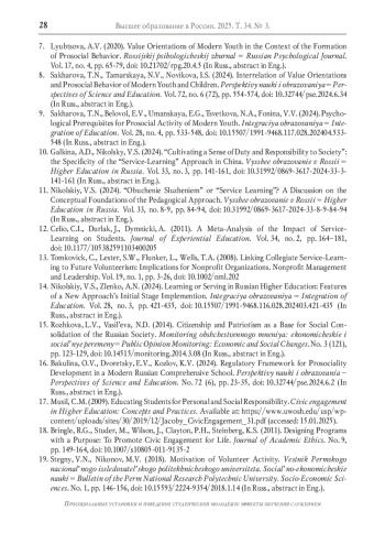17. Musil C.M. Educating students for personal and social responsibility // Civic engagement in higher education: Concepts and practices. 2009. Р. 49-68. URL: https://www.uwosh.edu/usp/wp-content/uploads/sites/30/2019/12/Jacoby_CivicEngagement_31.pdf (дата обращения: 15.01.2025).