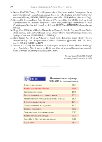 24. Руднева И.А., Козырева О.А. Формирование профессиональной идентичности будущих педагогов средствами обучения служением // Высшее образование в России. 2025. Т. 34. № 1. С. 63-81. DOI: 10.31992/0869-3617-2025-34-1-63-81 EDN: BYVHMX