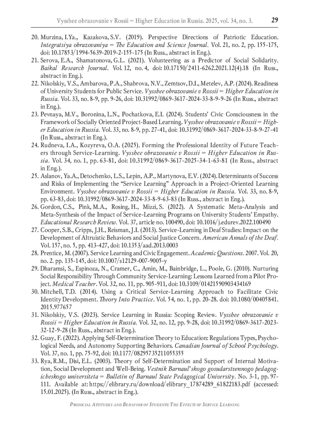 31. Никольский В.С. Обучение служением в России: становление предметного поля // Высшее образование в России. 2023. Т. 32. № 12. С. 9-28. 10.31992/0869- 3617-2023-32-12-9-28. DOI: 10.31992/0869-3617-2023-32-12-9-28 EDN: PWWCVL