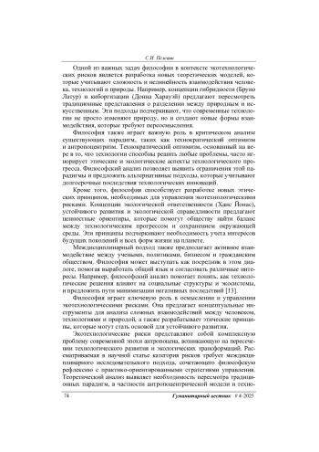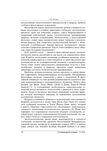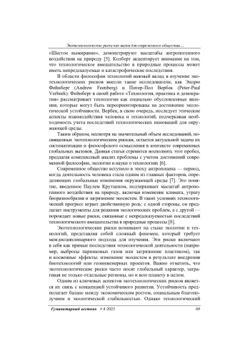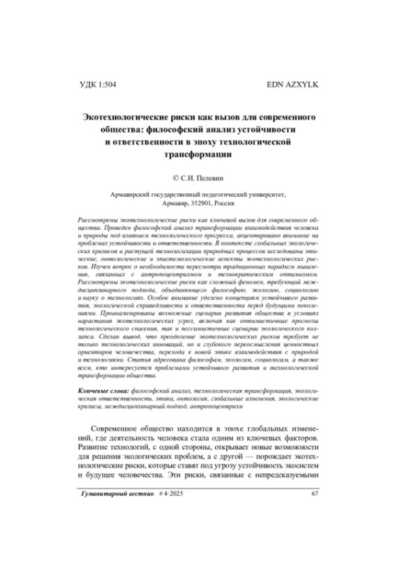 Рассмотрены экотехнологические риски как ключевой вызов для современного общества. Проведен философский анализ трансформации взаимодействия человека и природы под влиянием технологического прогресса, акцентировано внимание на проблемах устойчивости и ответственности. В контексте глобальных экологических кризисов и растущей технологизации природных процессов исследованы этические, онтологические и эпистемологические аспекты экотехнологических рисков. Изучен вопрос о необходимости пересмотра традиционных парадигм мышления, связанных с антропоцентризмом и технократическим оптимизмом. Рассмотрены экотехнологические риски как сложный феномен, требующий междисциплинарного подхода, объединяющего философию, экологию, социологию и науку о технологиях. Особое внимание уделено концепциям устойчивого развития, экологической справедливости и ответственности перед будущими поколениями. Проанализированы возможные сценарии развития общества в условиях нарастания экотехнологических угроз, включая как оптимистичные прогнозы технологического спасения, так и пессимистичные сценарии экологического коллапса. Сделан вывод, что преодоление экотехнологических рисков требует не только технологических инноваций, но и глубокого переосмысления ценностных ориентиров человечества, перехода к новой этике взаимодействия с природой и технологиями. Статья адресована философам, экологам, социологам, а также всем, кто интересуется проблемами устойчивого развития и технологической трансформации общества.