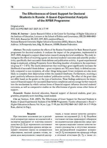 В работе проводится анализ эффективности грантовой программы Российского фонда фундаментальных исследований (РФФИ) для аспирантов. Исследуется влияние программы, реализованной в 2019-2020 гг. для поддержки диссертационных исследований аспирантов. Изучаются эффекты получения гранта на результативность и научную продуктивность аспирантов - то есть их успешную защиту и публикационную активность. В исследовании используется квазиэкспериментальный дизайн, в частности - Propensity Score Matching, который позволяет решить проблему самоотбора (количество аспирантов в экспериментальной группе N= 1 073). Результаты показывают, что получение гранта значительно повышает вероятность успешной защиты диссертации - при прочих равных у грантополучателей она выше на 70% по сравнению с теми, кто грант не получил. Грантополучатели также с большей вероятностью защищают диссертации в нормативный срок. Кроме того, получение гранта положительно влияет на публикационную активность аспирантов. Эффект от получения гранта не различается в зависимости от пола аспиранта и типа организации. Полученные результаты подтверждают значимость финансовой поддержки для успешной защиты диссертации и стимулируют дальнейшие исследования в области изучения механизмов влияния различных форматов финансовой поддержки на результативность аспирантов, а также сравнения эффективности грантов с другими мерами поддержки аспирантуры.