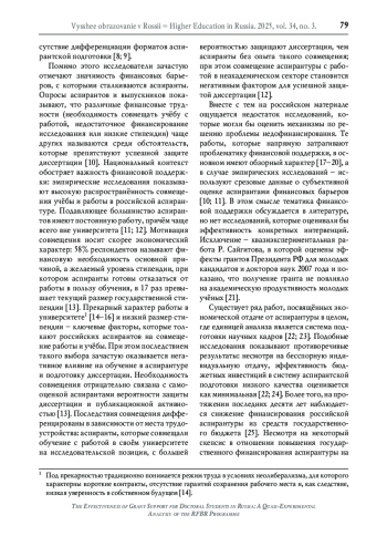 Помимо этого исследователи зачастую отмечают значимость финансовых барьеров, с которыми сталкиваются аспиранты. Опросы аспирантов и выпускников показывают, что различные финансовые трудности (необходимость совмещать учёбу с работой, недостаточное финансирование исследования или низкие стипендии) чаще других называются среди обстоятельств, которые препятствуют успешной защите диссертации [10]. Национальный контекст обостряет важность финансовой поддержки: эмпирические исследования показывают высокую распространённость совмещения учёбы и работы в российской аспирантуре. Подавляющее большинство аспирантов имеют постоянную работу, причём чаще всего вне университета [11; 12]. Мотивация совмещения носит скорее экономический характер: 58% респондентов называют финансовую необходимость основной причиной, а желаемый уровень стипендии, при котором аспиранты готовы отказаться от работы в пользу обучения, в 17 раз превышает текущий размер государственной стипендии [13].