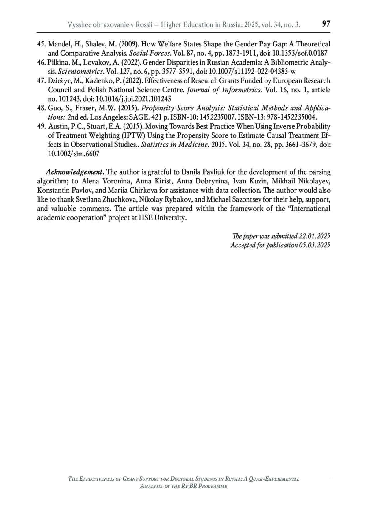 46. Pilkina M., Lovakov A. Gender disparities in Russian academia: a bibliometric analysis // Scientometrics. 2022. Vol. 127. No. 6. P. 3577-3591. DOI: 10.1007/s11192-022-04383-w EDN: ODFUYI