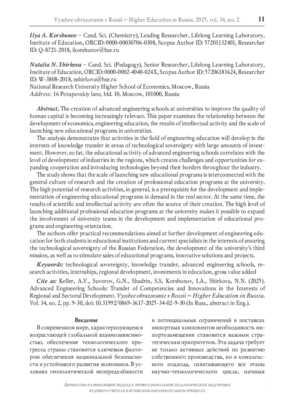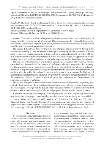 В условиях растущей потребности в опережающем технологическом развитии и кадровом суверенитете создание передовых инженерных школ в университетах для повышения качества человеческого капитала становится всё более актуальным. В работе исследуются взаимосвязи между развитием экономики, результатами интеллектуальной деятельности университетов и масштабом запуска новых образовательных программ в сфере инженерного образования. Проведённый анализ демонстрирует, что деятельность в области инженерного образования будет развиваться в интересах трансфера знаний в технологических областях с большими объёмами инвестиций. Однако пока образовательная активность передовых инженерных школ коррелирует с уровнем развития отраслей в регионах, что создаёт вызовы и возможности для расширения сотрудничества и внедрения технологий за их пределами во всей отрасли. Исследование показывает, что масштаб запуска новых образовательных программ взаимосвязан с общей культурой исследований и создания программ дополнительного профессионального образования в вузе. Высокий потенциал научно-исследовательской деятельности, в целом, является необходимым условием для разработки и внедрения востребованных в реальном секторе инженерных образовательных программ. При этом результаты интеллектуальной деятельности часто выступают источником их создания. Высокий уровень запуска в университете программ дополнительного профессионального образования позволяет расширить вовлечённость университетских команд в разработку и реализацию образовательных программ и инженерной направленности. Авторами предлагаются практические рекомендации, направленные на дальнейшее развитие инженерного образования как обучающихся в образовательных организациях, так и действующих специалистов в интересах технологического прогресса Российской Федерации, реализации третьей миссии университета, а также на стимулирование продаж образовательных программ, инновационных решений и проектов.