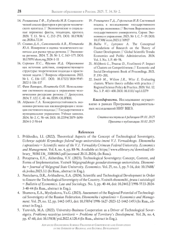1. Приходько И.И. Теоретические аспекты концепции технологического суверенитета // Учёные записки Крымского федерального университета имени В.И. Вернадского. Экономика и управление. 2022. Т. 8. № 4. С. 88-96. EDN: BJFQTC