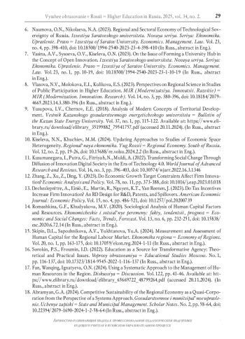 8. Власова Н.Ю., Молокова Е.Л., Куликова Е.С. Перспективы региональной науки в исследованиях общественного участия в высшем образовании // МИР (Модернизация. Инновации. Развитие). 2023. Т. 14. № 3. С. 380-396. DOI: 10.18184/2079-4665.2023.14.3.380-396 EDN: ECXVZX
