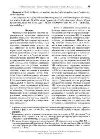 Настоящий этап развития общества характеризуется процессами динамичного развития технологий искусственного интеллекта (ИИ) и их интеграции в различные сферы жизнедеятельности человека. Такая тенденция инновационного развития нашла отражение во многих федеральных нормативных документах, определяющих векторы развития всех секторов экономики страны. В частности, в Стратегии научно-технологического развития РФ одним из государственных приоритетов на период до 2035 г. определяется «переход к передовым цифровым, интеллектуальным производственным технологиям, роботизированным системам, новым материалам и способам конструирования, создание систем обработки больших объёмов данных, машинного обучения и искусственного интеллекта».