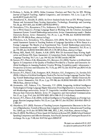34. Almusharraf N., Alotaibi H. An error-analysis study from an EFL writing context: Human and Automated Essay Scoring Approaches // Technology, Knowledge and Learning. 2023. Vol. 28. P. 1015-1031. DOI: 10.1007/s10758-022-09592-z EDN: NMOQGA