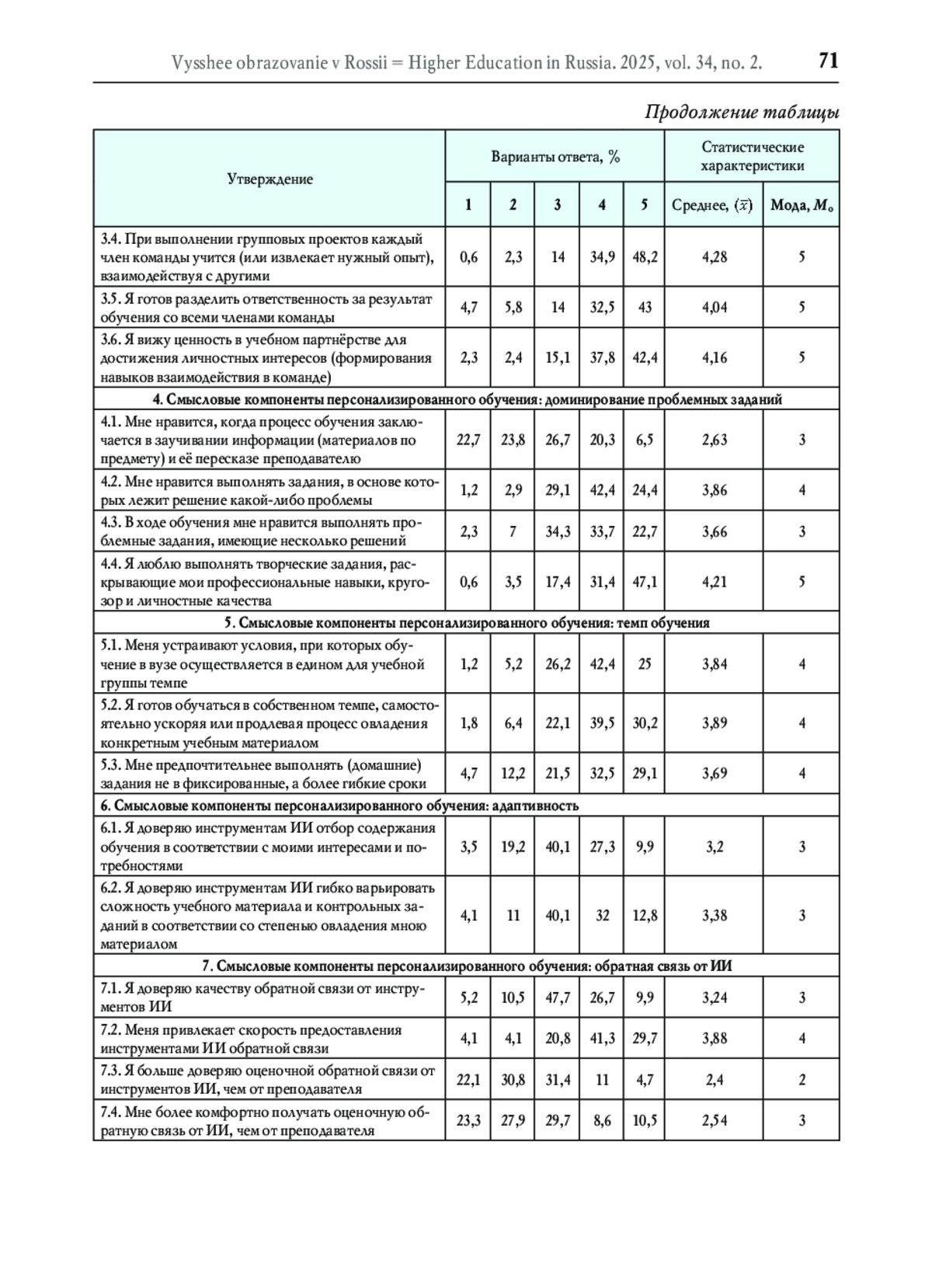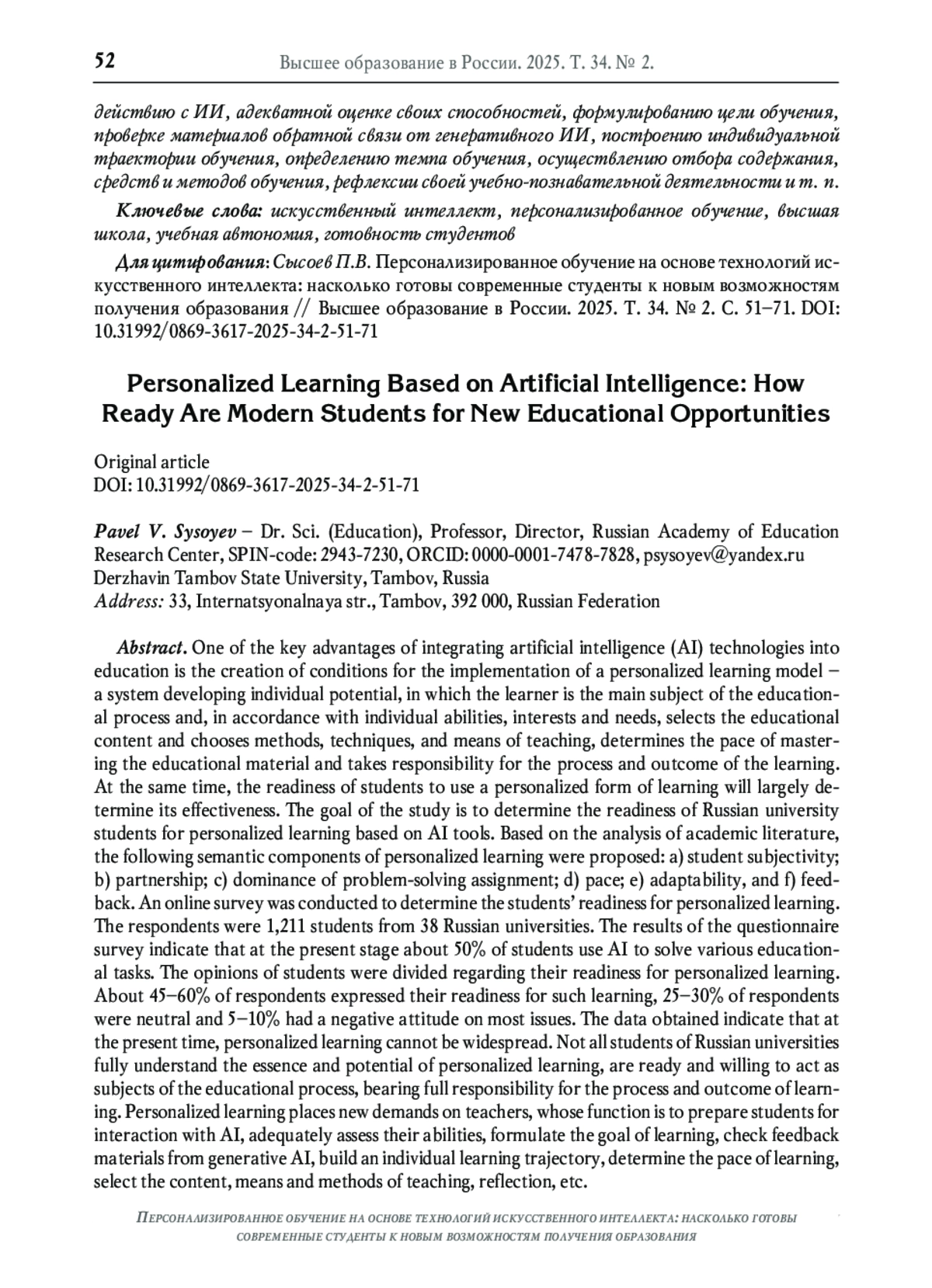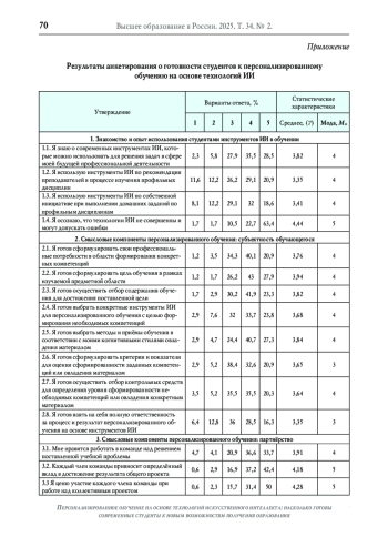 Одно из ключевых достоинств интеграции технологий искусственного интеллекта (ИИ) в образование заключается в создании на их основе условий для реализации модели персонализированного обучения - системы обучения и развития потенциала личности, при которой обучающийся выступает основным субъектом учебного процесса и в соответствии с индивидуальными способностями, интересами и потребностями осуществляет отбор содержания обучения и выбор методов, приёмов, средств обучения, определяет темп овладения учебным материалом и берёт на себя ответственность за процесс и результат обучения. Вместе с тем готовность обучающихся использовать персонализированную форму обучения будет во многом определять его эффективность. Цель исследования - определить готовность студентов российских вузов к персонализированному обучению посредством инструментов ИИ. На основе анализа научной литературы были предложены смысловые компоненты персонализированного обучения: а) субъектность обучающихся; б) партнёрство; в) доминирование проблемных заданий; г) темп; д) адаптивность и е) обратная связь. Для определения готовности студентов к персонализированному обучению было проведено онлайн-анкетирование. В качестве респондентов выступили 1211 студентов из 38 вузов РФ. Результаты анкетного опроса свидетельствуют о том, что на современном этапе около 50% студентов используют ИИ для решения разных учебных задач. Относительно готовности к персонализированному обучению мнения студентов разделились. Около 45-60% респондентов выразили готовность к такому обучению, 25-30% опрошенных - нейтральное и 5-10% отрицательное отношение по большинству вопросов. Полученные данные свидетельствуют о том, что на текущий момент персонализированное обучение не может быть массовым. Далеко не все студенты российских вузов полностью представляют сущность и потенциал персонализированного обучения, готовы и желают выступать субъектами учебного процесса, несущими полную ответственность за процесс и результат обучения. Персонализированное обучение предъявляет новые требования к педагогам, функция которых заключается в подготовке обучающихся к взаимодействию с ИИ, адекватной оценке своих способностей, формулированию цели обучения, проверке материалов обратной связи от генеративного ИИ, построению индивидуальной траектории обучения, определению темпа обучения, осуществлению отбора содержания, средств и методов обучения, рефлексии своей учебно-познавательной деятельности и т. п.
