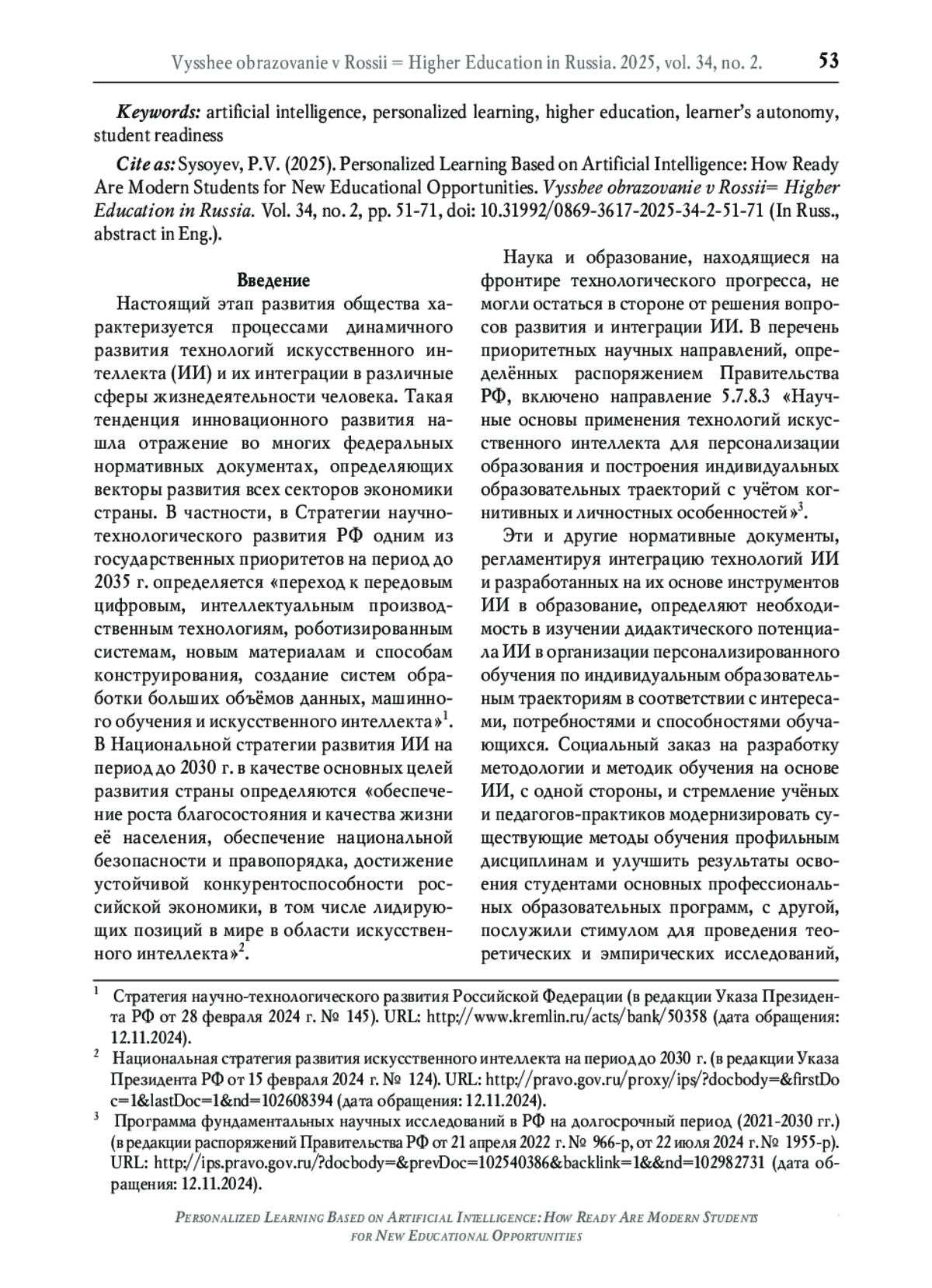 29. Сысоев П.В. Искусственный интеллект в образовании: осведомлённость, готовность и практика применения преподавателями высшей школы технологий искусственного интеллекта в профессиональной деятельности // Высшее образование в России. 2023. Т. 32. № 10. С. 9-33. DOI: 10.31992/0869-3617-2023-32-10-9-33 EDN: TZYTKM