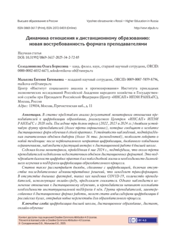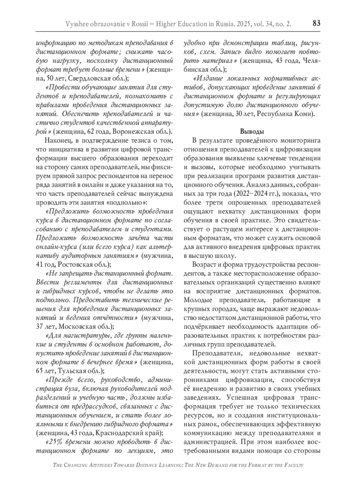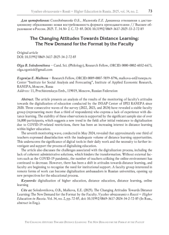 В статье представлен анализ результатов мониторинга отношения преподавателей к цифровизации образования, реализуемого Центром «ИНСАП» ИПЭИ РАНХиГС с 2020 года. Последние три волны опроса (2022, 2023 и 2024 гг.) выявили устойчивую группу преподавателей (более трети опрошенных), которые сообщают о нехватке дистанционных форм обучения в своей практике. Устойчивость наблюдений, подтверждённая значительным объёмом выборки (более 16 тыс. респондентов), позволяет говорить о новой тенденции: после первоначального неприятия цифровизации, вызванного ковидными ограничениями, наблюдается растущий интерес к дистанционной работе в высшей школе. Седьмая волна мониторинга, проведённая в мае 2024 г., подтвердила, что около трети преподавателей недовольны недостаточным объёмом дистанционных форматов. Это подчёркивает важность цифровых практик в их повседневной жизни и необходимость дальнейшего изучения и поддержки цифровизации образовательного процесса. Статья также рассматривает вызовы, связанные с цифровизацией, включая отсутствие последовательных административных решений, что замедляет трансформацию. В отсутствие внешних факторов, таких как пандемия COVID-19, количество преподавателей, использующих онлайн-среду, продолжает снижаться. Однако наблюдается изменение отношения к дистанционному обучению, и преподаватели начинают осознавать необходимость институциональной поддержки в нём. Группа преподавателей, заинтересованных в дистанционных формах работы, может стать амбассадорами цифровизации в российских вузах, открывая новые перспективы для образовательного процесса.