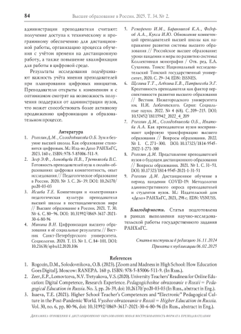 9. Рогозин Д.М. Дистанционное обучение в период пандемии COVID-19: Методология административного опроса преподавателей и студентов вузов. М.: Издательский дом “Дело” РАНХиГС, 2021, 298 с. EDN: VSNUSS