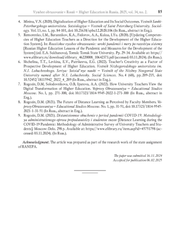 8. Рогозин Д.М. Представление преподавателей вузов о будущем дистанционного образования // Вопросы образования. 2021. № 1. С. 31-51. DOI: 10.17323/1814-9545-2021-1-31-51 EDN: NJLSZU