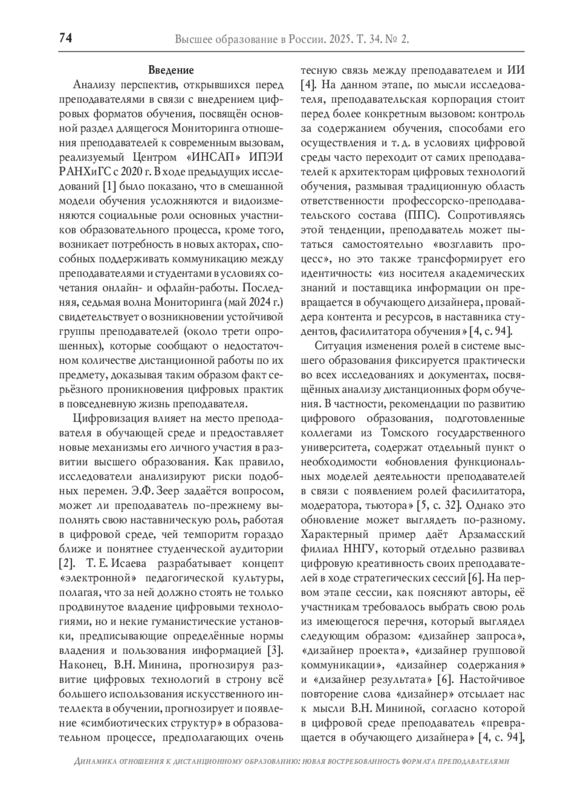 3. Исаева Т.Е. Компетенции и “электронная” педагогическая культура преподавателя высшей школы в постпандемическом мире // Высшее образование в России. 2021. Т. 30. № 6. С. 80-96. DOI: 10.31992/0869-3617-2021-30-6-80-96 EDN: YTOOXF