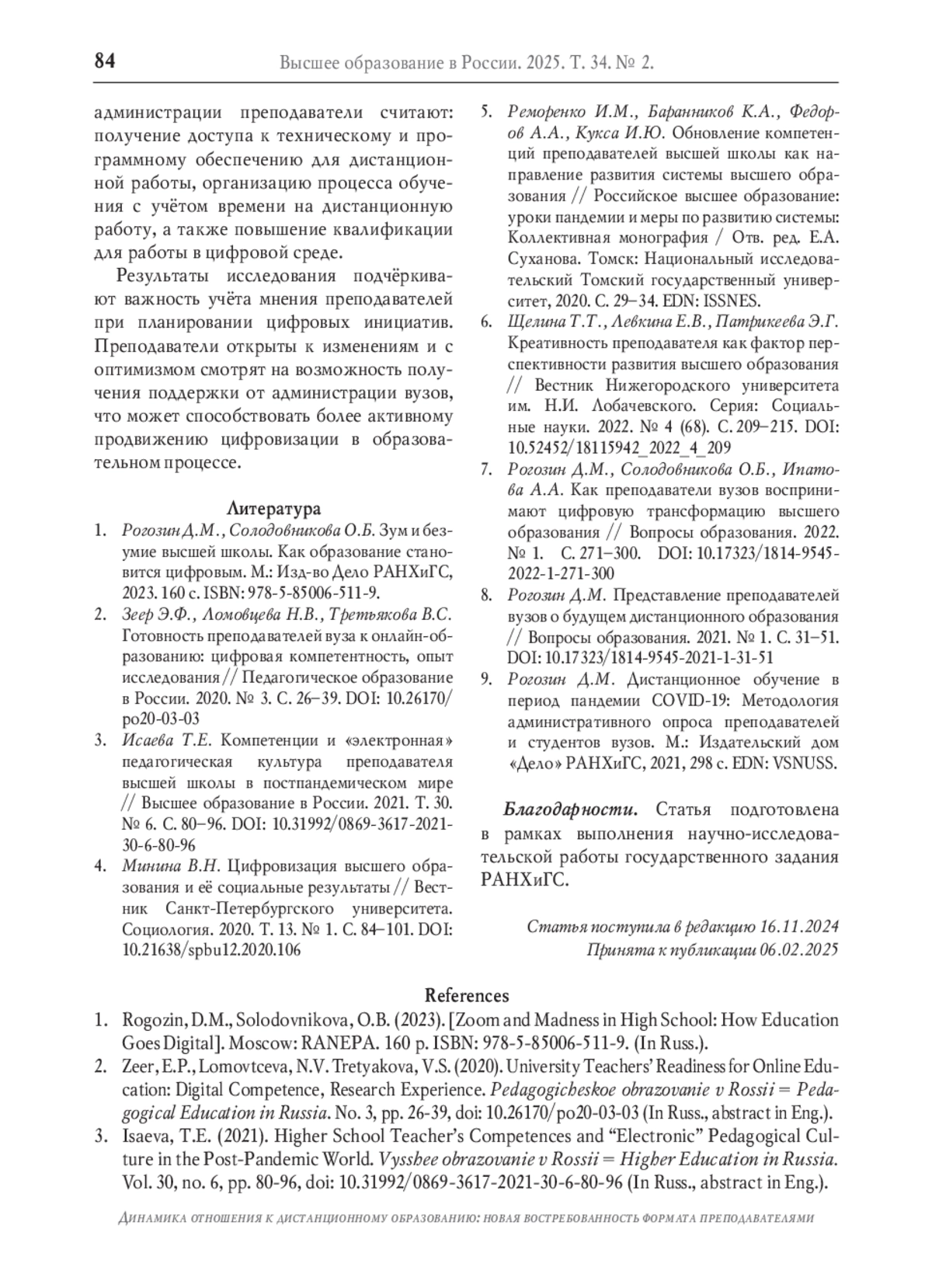 7. Рогозин Д.М., Солодовникова О.Б., Ипатова А.А. Как преподаватели вузов воспринимают цифровую трансформацию высшего образования // Вопросы образования. 2022. № 1. С. 271-300. DOI: 10.17323/1814-9545-2022-1-271-300 EDN: KLQTLU