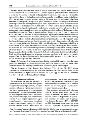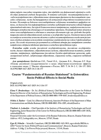 В статье представлены результаты исследования информационных потоков в социальных медиа о курсе «Основы российской государственности». Учитывая степень гибридизации медиасферы, а также погружённость студентов в цифровую среду, наиболее полное представление об эффектах реализации курса можно составить, опираясь на цифровые следы, оставленные Интернет-пользователями - студентами, освоившими курс, и другими аудиториями, вовлечёнными в процесс разработки и преподавания дисциплины. Методика исследования является двухступенчатой и включает в себя применение когнитивного картирования контента на тему внедрения курса, а также автоматизированный социально-медийный анализ информационных потоков в 2023-2024 годах. Авторы подвергают анализу содержание контента о курсе позитивной и негативной модальности, смысловое ядро информационного потока, его технологическое обеспечение, а также структуру и интересы вовлечённой аудитории. Информационный поток, формируемый сторонниками курса, доминировал над оппонирующим по всем сетевым параметрам. При этом дискурс позитивного сегмента носит сугубо повествовательный характер и не транслирует смысловые концепты курса, что придаёт ему формальный характер и создаёт образ рутинной учебной дисциплины. В попытке избежать «политизированности» и «идеологизированности» образовательные организации фактически выхолащивают смысловое содержание, часто дистанцируются от актуальной общественно-политической повестки. Несмотря на довольно консолидированное содержание позитивного цифрового потока, его важность для информирования ключевых аудиторий отмечается явный дефицит проактивной повестки, дискурсов деятельностного патриотизма, направленности на конвертацию активности обучающихся в позитивные практики. Негативный поток является менее консолидированным и объёмным и зачастую обозначает курс как средство дискредитации российской образовательной системы и государства в целом. Контент такого рода несмотря на немногочисленность является глубоко политизированным и позволяет различным сетевым акторам использовать конкретные университетские кейсы в провокативных целях. На основе полученных результатов исследования авторы рассматривают ключевые направления совершенствования практики и методики преподавания курса.