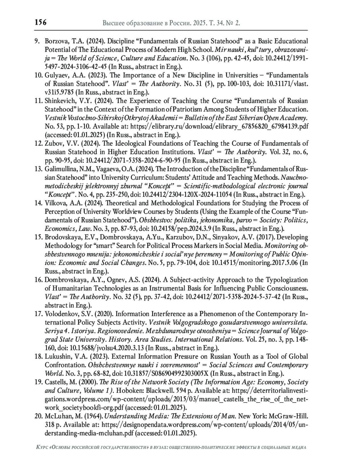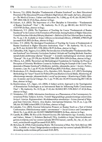 10. Гуляев А.А. Значимость новой дисциплины “Основы Российской государственности” в вузах // Власть. 2023. Т. 31. № 5. С. 100-103. DOI: 10.31171/vlast.v31i5.9785 EDN: RODWMH