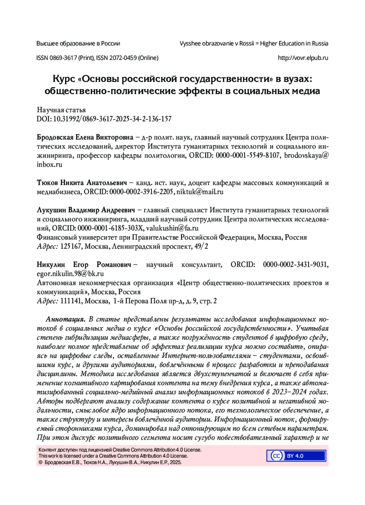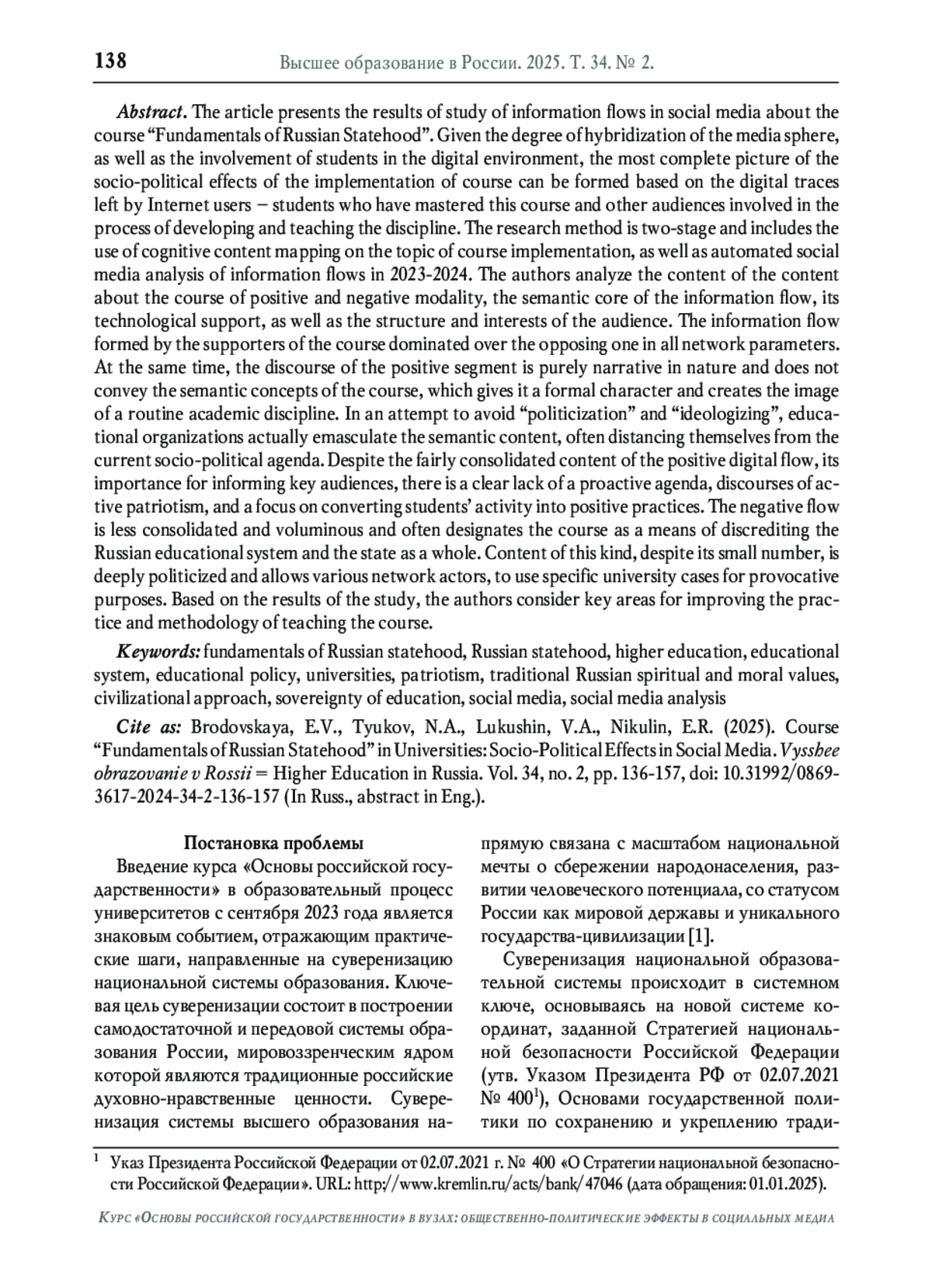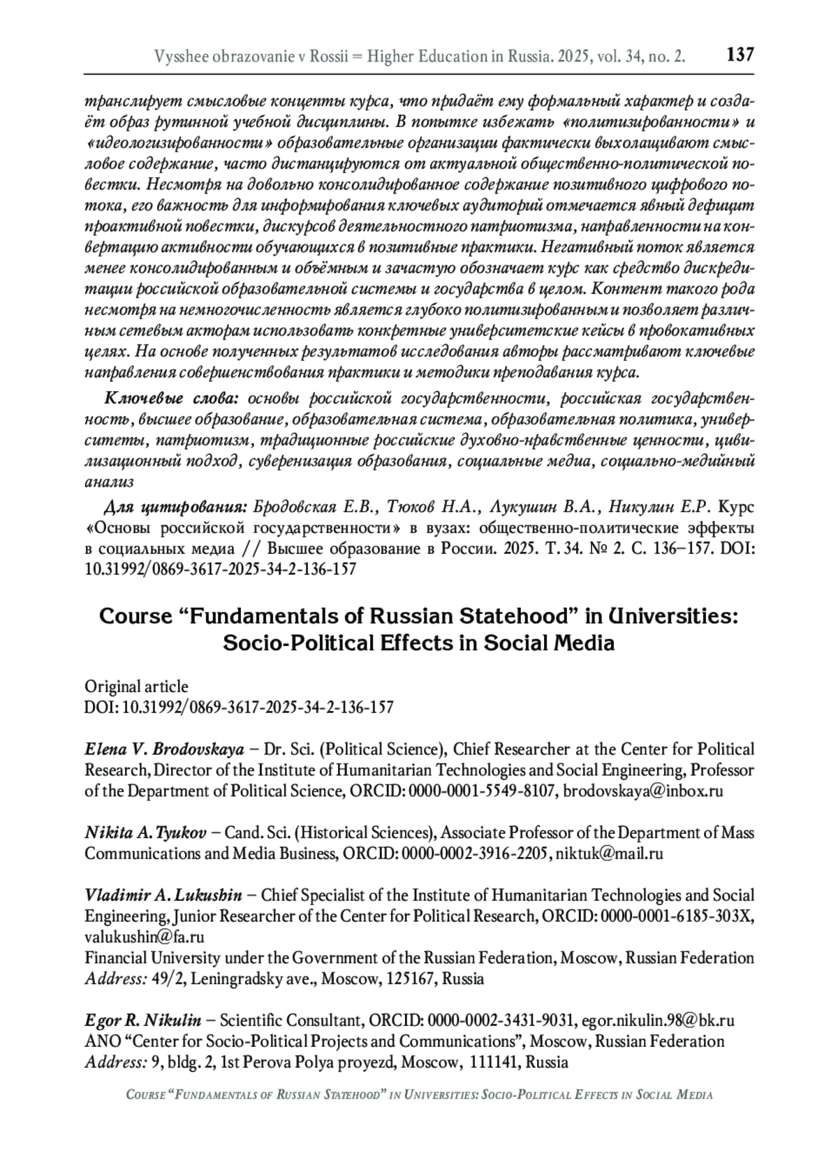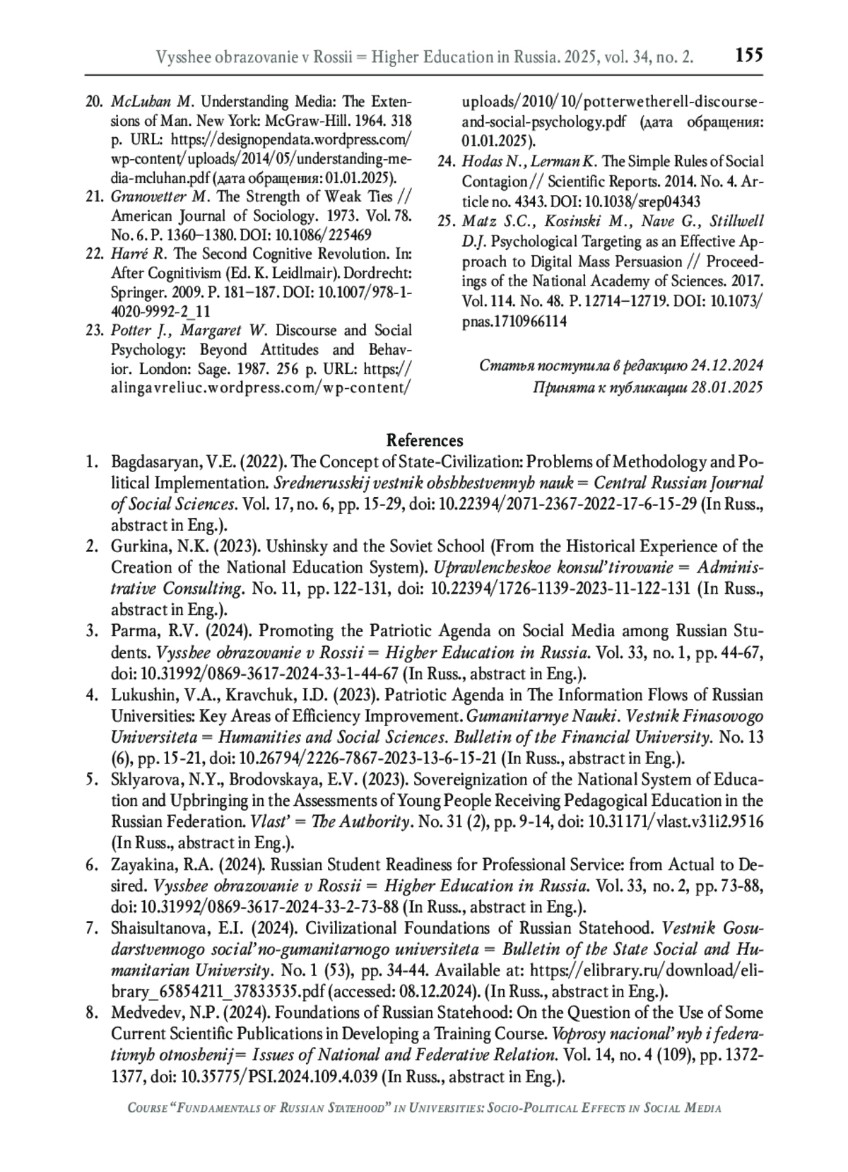 3. Парма Р.В. Продвижение патриотической повестки в социальных медиа среди российской студенческой молодёжи // Высшее образование в России. 2024. Т. 33. № 1. С. 44-67. DOI: 10.31992/0869-3617-2024-33-1-44-67 EDN: LLCBSO