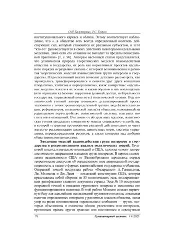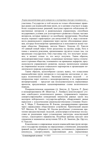 Проблема взаимодействия общества и государства, артикулируемая через деятельность групп интересов, является одной из центральных в современной социальной философии и политической науке. Теоретические модели, описывающие это взаимодействие, — от классического плюрализма до неокорпоративизма и элитистких концепций, как правило, выходят за рамки строгого эмпирического анализа, приобретают черты нормативных проектов, предлагают видение идеального политического порядка и оказываются весьма утопичны. Они строятся на фундаменте идеализированных допущений о природе человека, возможностях равного доступа к ресурсам, нейтральности государственных институтов, саморегулирующейся конкуренции или достижимости управляемого консенсуса.