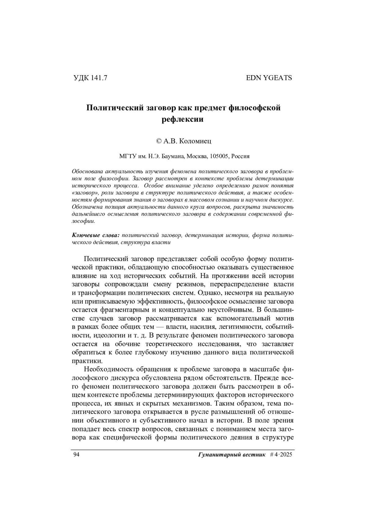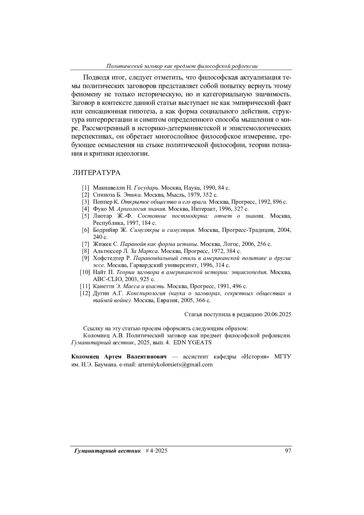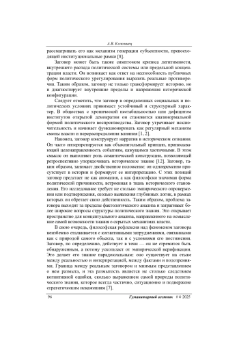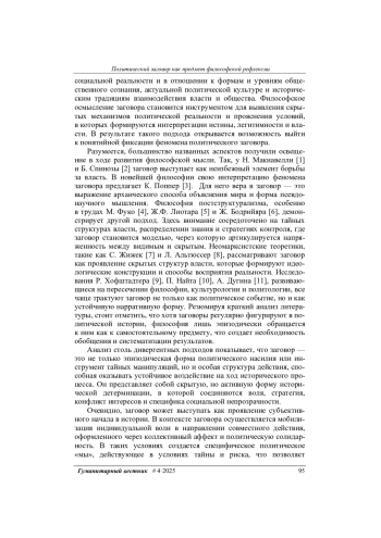 Политический заговор представляет собой особую форму политической практики, обладающую способностью оказывать существенное влияние на ход исторических событий. На протяжении всей истории заговоры сопровождали смену режимов, перераспределение власти и трансформации политических систем. Однако, несмотря на реальную или приписываемую эффективность, философское осмысление заговора остается фрагментарным и концептуально неустойчивым. В большинстве случаев заговор рассматривается как вспомогательный мотив в рамках более общих тем — власти, насилия, легитимности, событийности, идеологии и т. д. В результате феномен политического заговора остается на обочине теоретического исследования, что заставляет обратиться к более глубокому изучению данного вида политической практики.