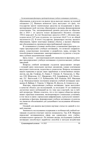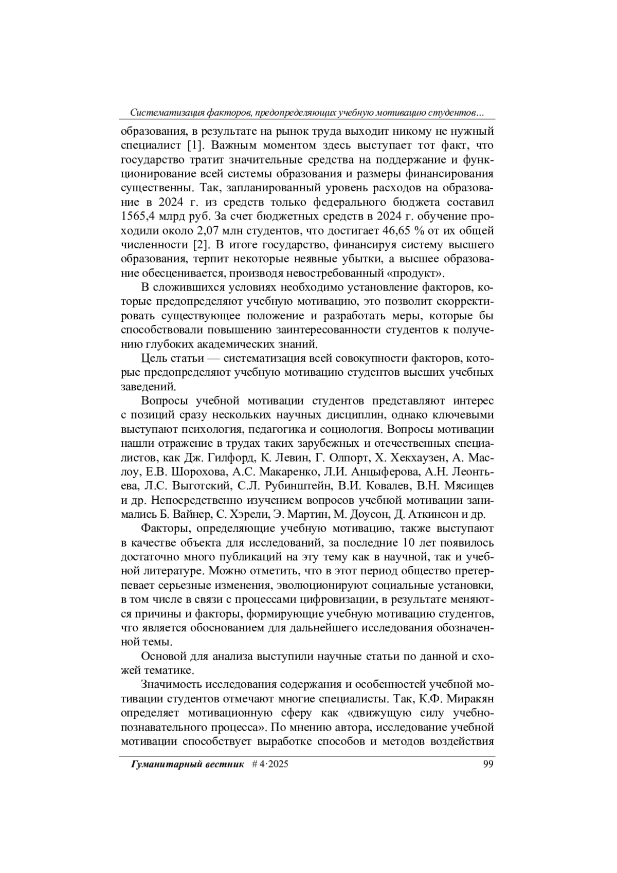 Исследование вопросов формирования учебной мотивации и факторов, ее определяющих, актуально по нескольким причинам. Например, для каждой конкретной личности наличие учебной мотивации в процессе обучения в высших учебных заведениях — это залог получения глубоких знаний, которые потом можно будет применить в практической профессиональной деятельности. Для социума учебная мотивация означает, что после выпуска из образовательного учреждения общество получит молодого специалиста, способного внести свой достойный вклад в социально-экономическое и научное развитие страны. Однако современная система высшего образования обладает определенными недостатками, что негативно отражается как на качестве образования, так и на состоянии рынка труда. Согласно оценке HRспециалиста и эксперта в области управления М. Недякина, около 50 % выпускников российских вузов не работают по выбранной специальности, а приблизительно 30 % выбирают другой профиль. Как полагает эксперт, это связано с тем, что в стране наблюдается культ высшего образования, в результате на рынок труда выходит никому не нужный специалист [1]. Важным моментом здесь выступает тот факт, что государство тратит значительные средства на поддержание и функционирование всей системы образования и размеры финансирования существенны. Так, запланированный уровень расходов на образование в 2024 г. из средств только федерального бюджета составил 1565,4 млрд руб. За счет бюджетных средств в 2024 г. обучение проходили около 2,07 млн студентов, что достигает 46,65 % от их общей численности [2]. В итоге государство, финансируя систему высшего образования, терпит некоторые неявные убытки, а высшее образование обесценивается, производя невостребованный «продукт».