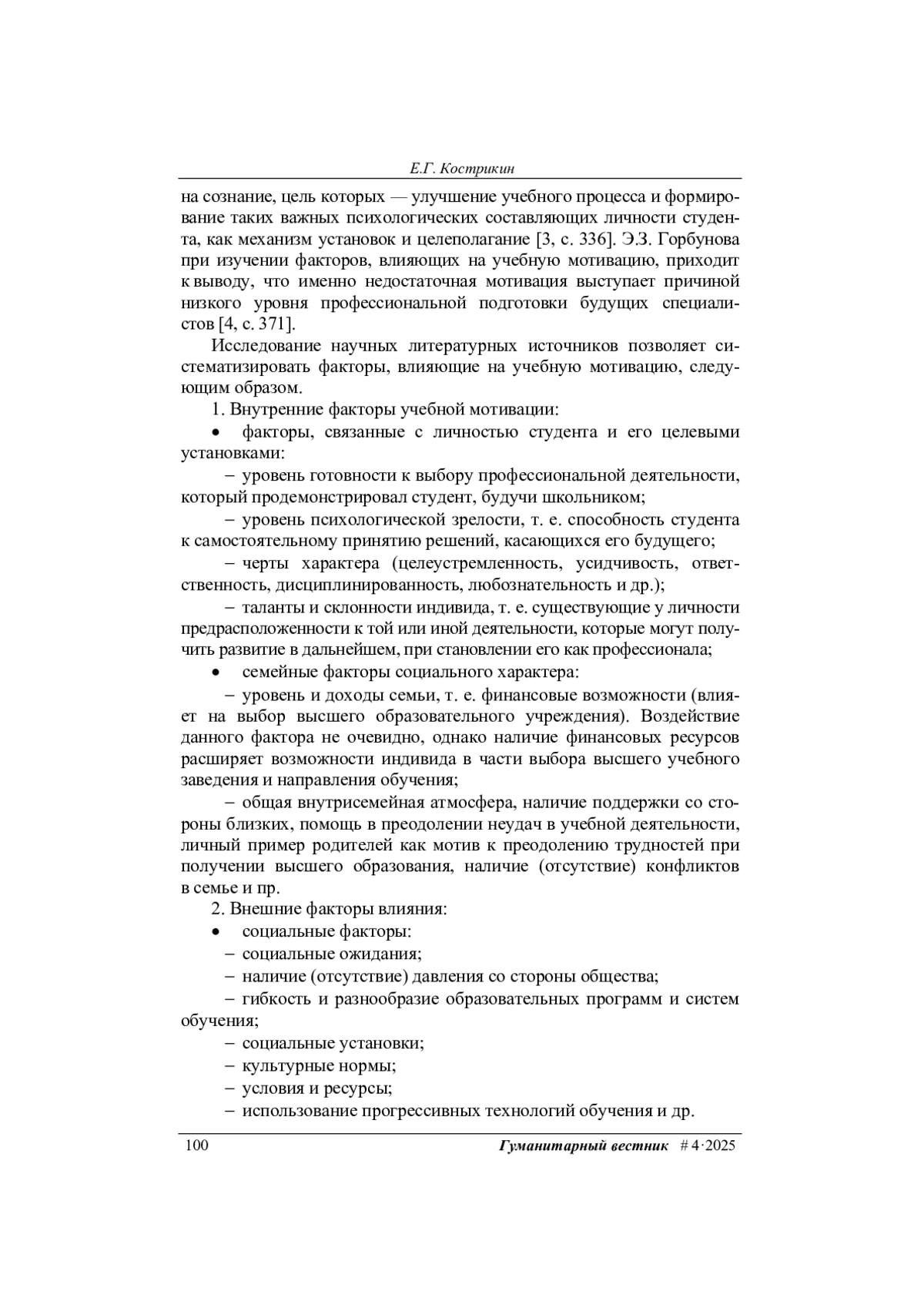 Обоснована значимость исследования внешних и внутренних факторов, предопределяющих учебную мотивацию студентов, и дана их детализация. К внутренним факторам отнесены не только личностные особенности студента (черты характера, склонности, таланты, уровень осознанности), но и внутрисемейные факторы (психологическая обстановка в семье и финансовые возможности). Обобщены внешние факторы, предложено их деление на социальные факторы, факторы, влияющие на выбор конкретного вуза, и факторы организации учебного процесса в образовательном учреждении. Установлено, что учебная мотивация — это сложная категория, которая складывается под влиянием целой совокупности факторов, одни из них оказывают сильное влияние, а другие — несущественное. Сделан вывод о необходимости дальнейшего исследования факторов, влияющих на учебную мотивацию студентов с учетом меняющихся условий внешней среды и развития социума.