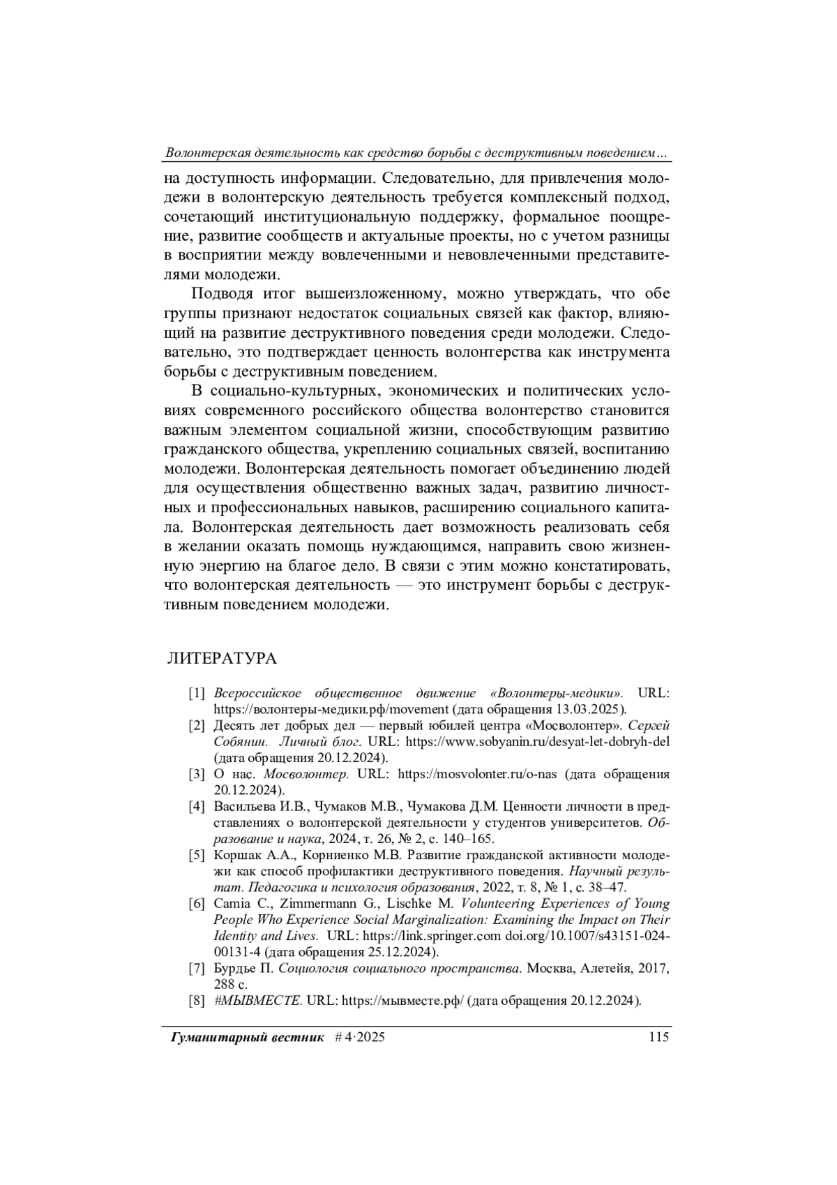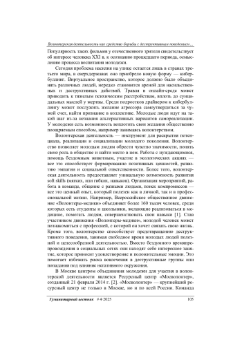 6. Camia C., Zimmermann G., Lischke M. Volunteering Experiences of Young People Who Experience Social Marginalization: Examining the Impact on Their Identity and Lives. URL: https://link.springer.com 10.1007/s43151-024-00131-4 (дата обращения 25.12.2024). DOI: 10.1007/s43151-024-00131-4(