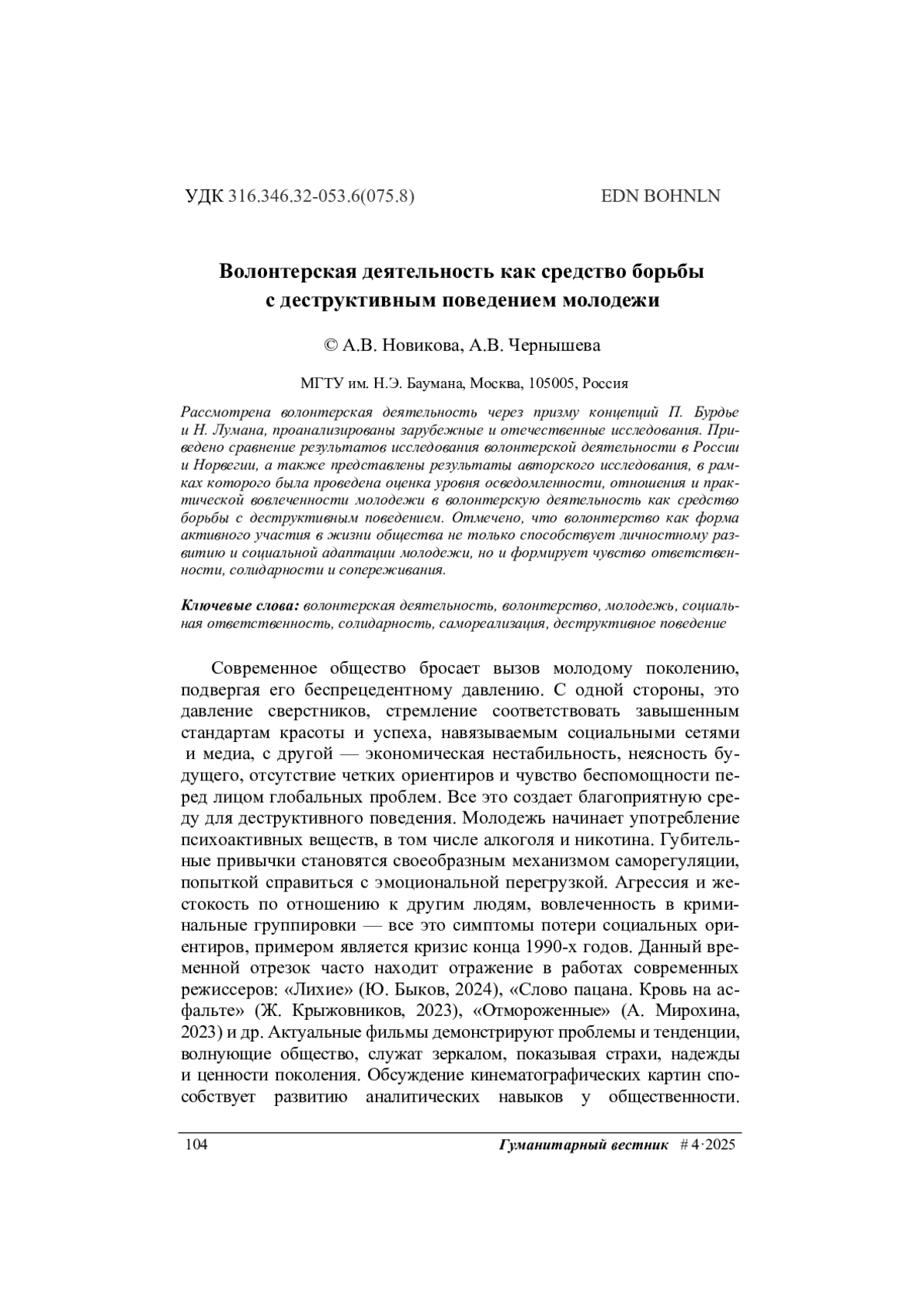 Рассмотрена волонтерская деятельность через призму концепций П. Бурдье и Н. Лумана, проанализированы зарубежные и отечественные исследования. Приведено сравнение результатов исследования волонтерской деятельности в России и Норвегии, а также представлены результаты авторского исследования, в рамках которого была проведена оценка уровня осведомленности, отношения и практической вовлеченности молодежи в волонтерскую деятельность как средство борьбы с деструктивным поведением. Отмечено, что волонтерство как форма активного участия в жизни общества не только способствует личностному развитию и социальной адаптации молодежи, но и формирует чувство ответственности, солидарности и сопереживания.
