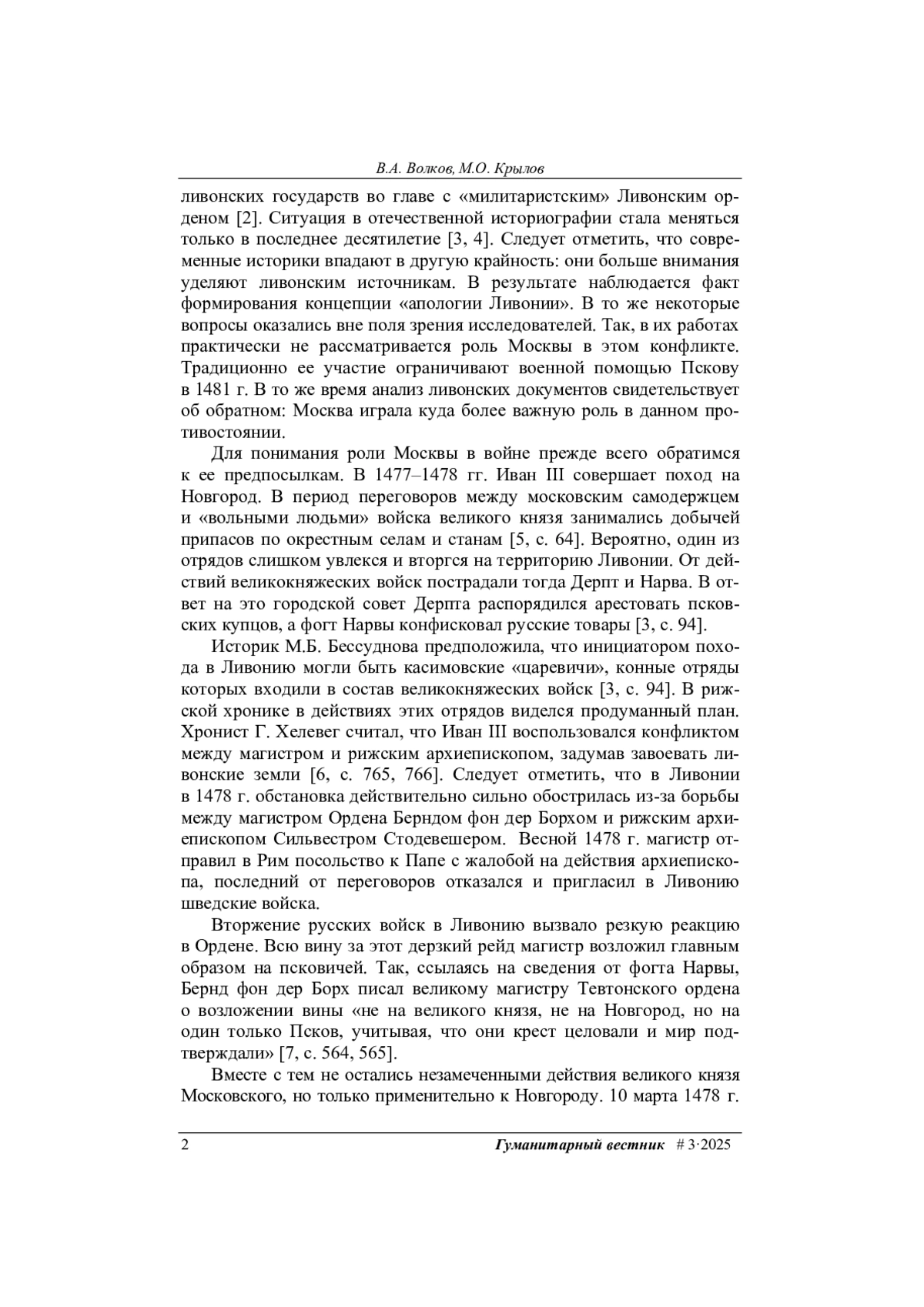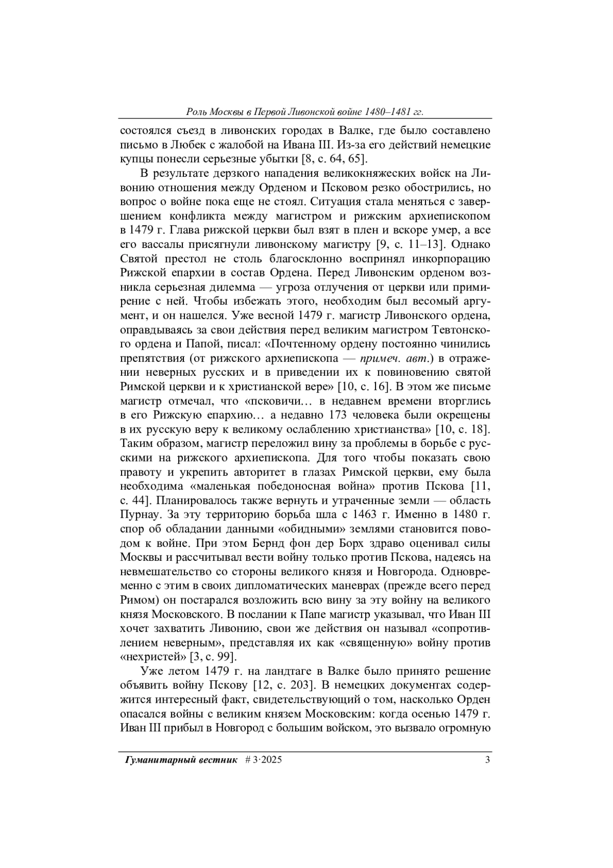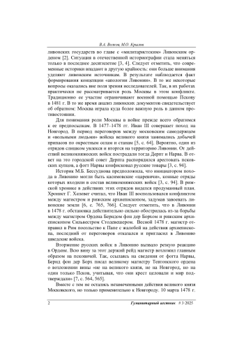 Русско-ливонская война (1480–1481) является одним из значимых событий отечественной истории конца XV в. Она стала прологом к более масштабным столкновениям Русского государства с Ливонией в грядущем столетии. В этом противостоянии Ливонский орден впервые столкнулся не только с пограничными Псковом и Новгородом, но и с единым Русским государством. Поэтому данный конфликт должен именоваться Первой Ливонской войной. Однако в отечественной историографии эта война практически не получила должного освещения. Основная причина — использование историками главным образом русскоязычных источников [1]. Между тем существует большой комплекс ливонских материалов, включающий в себя официальную переписку должностных лиц Ордена, донесения европейских дипломатов, письма частных лиц и др. (Liv-, Est- und Kurländisches Urkundenbuch), который практически не рассматривался или фрагментарно привлекался историками. Причем привлекался исключительно в рамках концепции экспансионистской политики ливонских государств во главе с «милитаристским» Ливонским орденом [2]. Ситуация в отечественной историографии стала меняться только в последнее десятилетие [3, 4]. Следует отметить, что современные историки впадают в другую крайность: они больше внимания уделяют ливонским источникам. В результате наблюдается факт формирования концепции «апологии Ливонии». В то же некоторые вопросы оказались вне поля зрения исследователей. Так, в их работах практически не рассматривается роль Москвы в этом конфликте. Традиционно ее участие ограничивают военной помощью Пскову в 1481 г. В то же время анализ ливонских документов свидетельствует об обратном: Москва играла куда более важную роль в данном противостоянии.