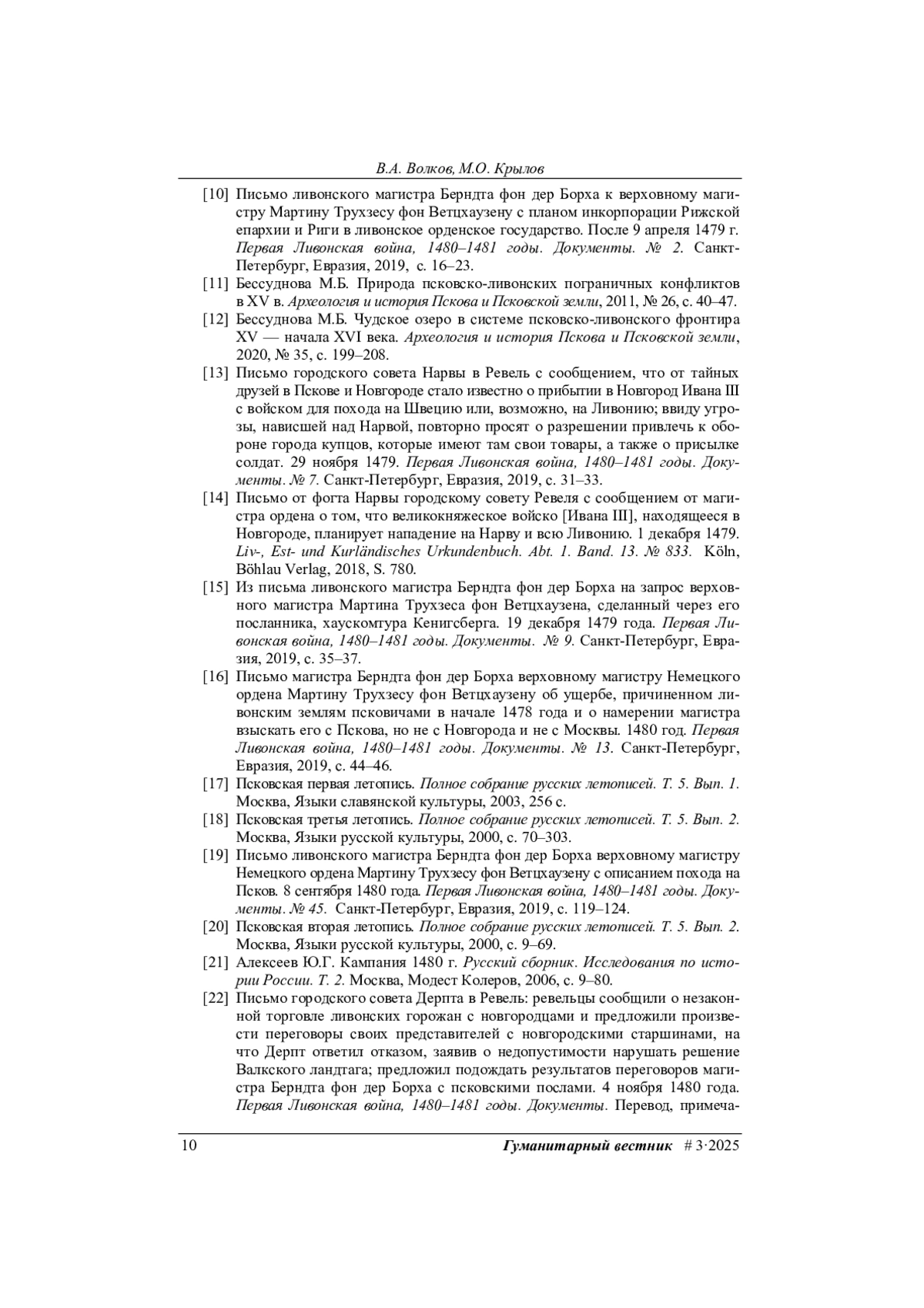 11. Бессуднова М.Б. Природа псковско-ливонских пограничных конфликтов в XV в. Археология и история Пскова и Псковской земли, 2011, № 26, с. 40-47.