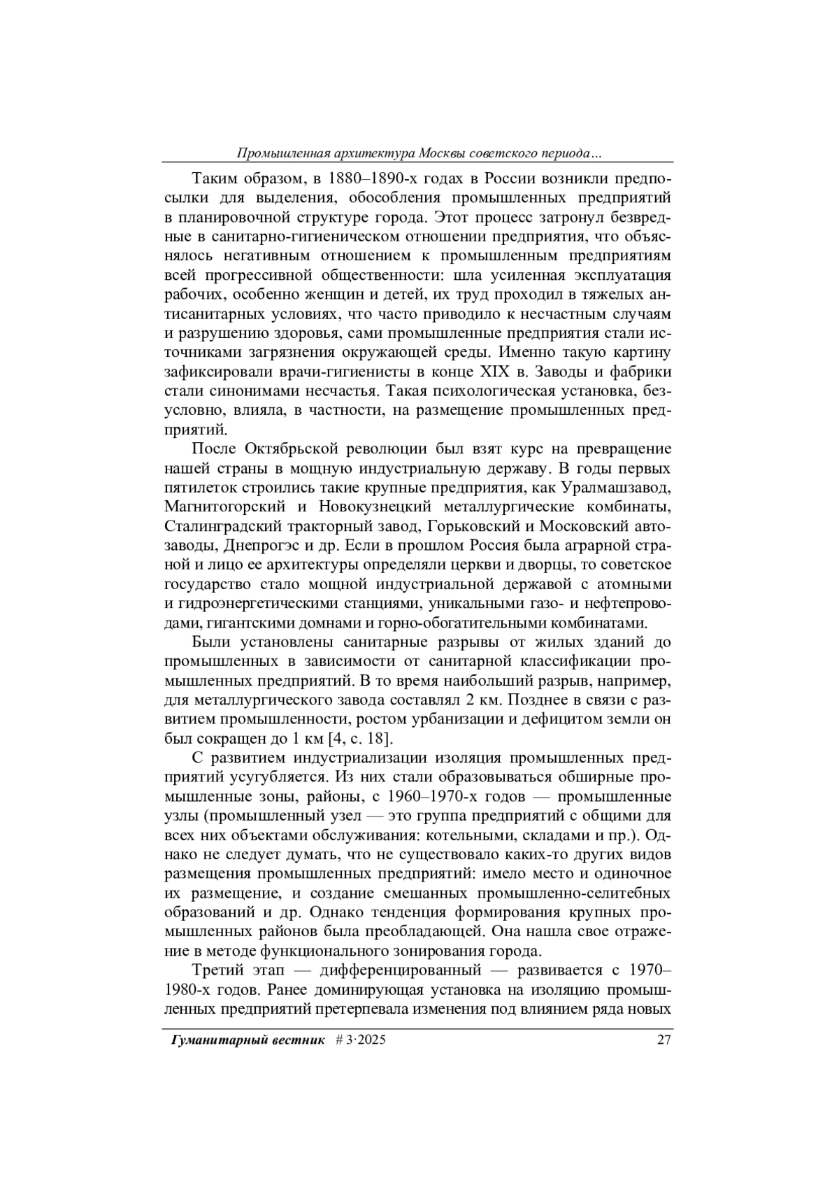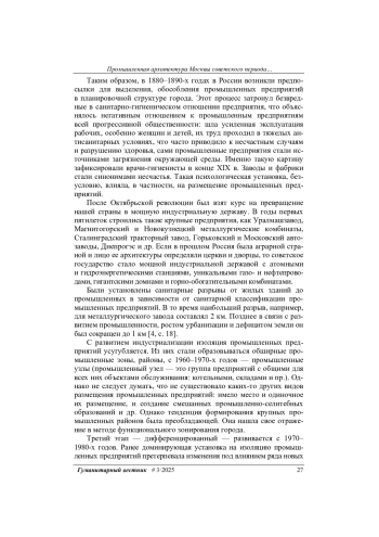 Рассмотрены социальные и эстетические проблемы развития промышленной архитектуры Москвы. Исследована эволюция градостроительных решений, связанных с взаимным размещением промышленной и селитебной (жилой) зон. Эволюционный подход помогает установить причины преемственности и новаторства в вопросах размещения промышленности и селитьбы, в их диалектической взаимосвязи друг с другом и факторами, их породившими. Сделан вывод о целесообразности применения всех существующих видов взаимного размещения промышленных предприятий и жилых районов, что определяется многообразием производственных, социальных, градостроительных и других жизненных процессов.