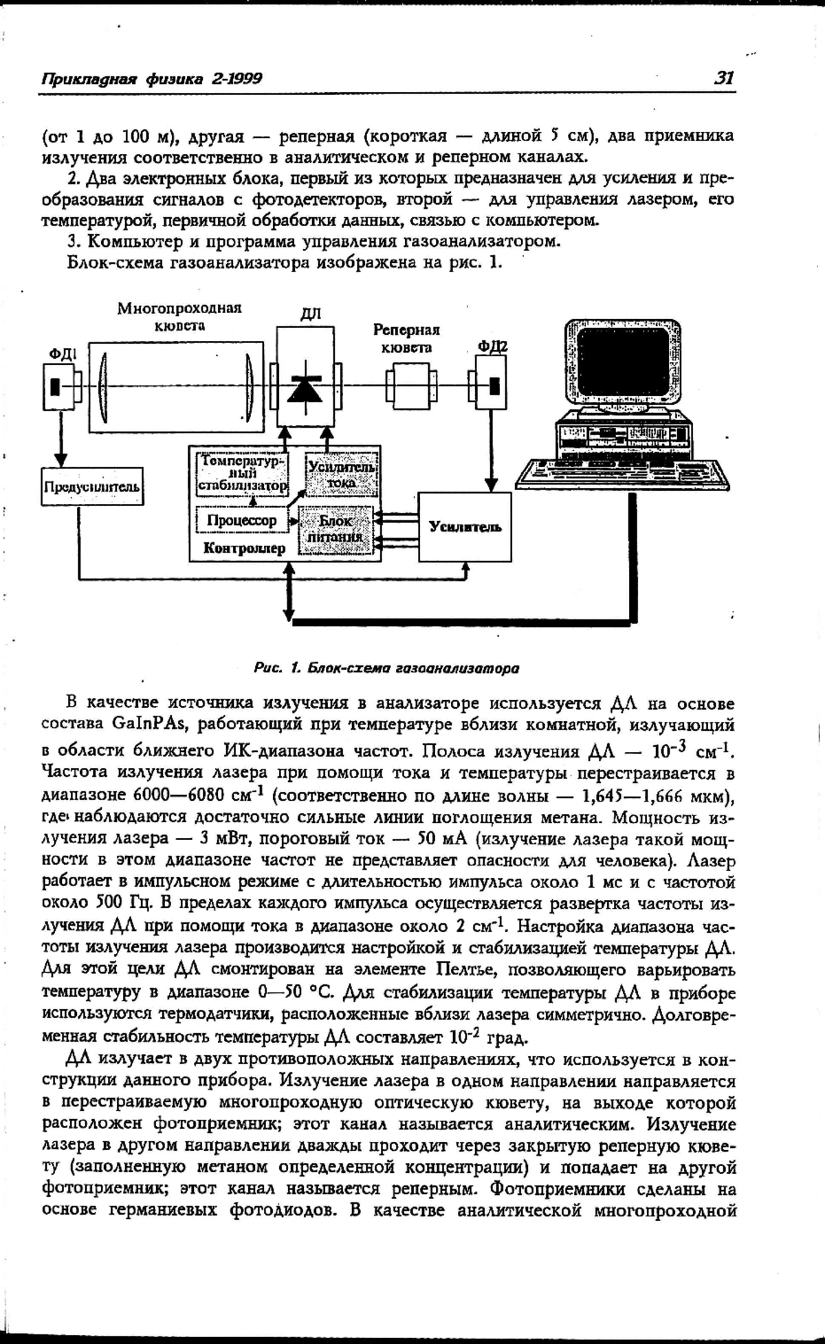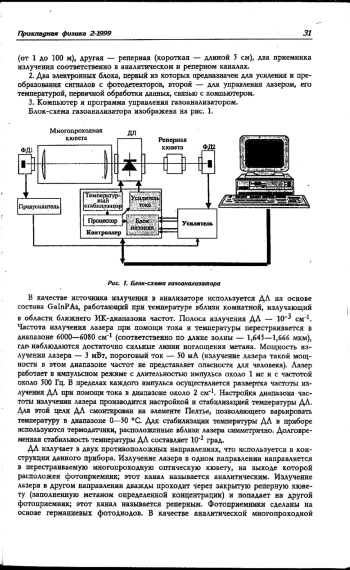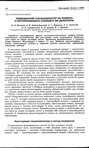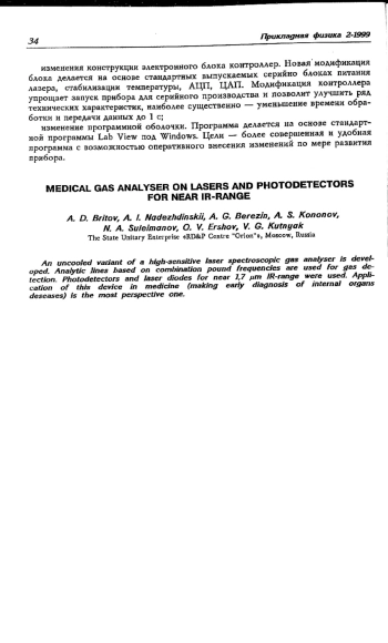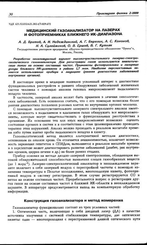 Разработан неохлаждаемый вариант высокочувствительного лазерно-спектроскопического газоанализатора. Для регистрации газов используются аналитические линии на основе составных частот. Применены фотоприемники и лазерные диоды ближнего ИК-диапазона в районе 1,7 мкм. Наиболее перспективным является использование прибора в медицине (ранняя диагностика заболеваний внутренних органов).