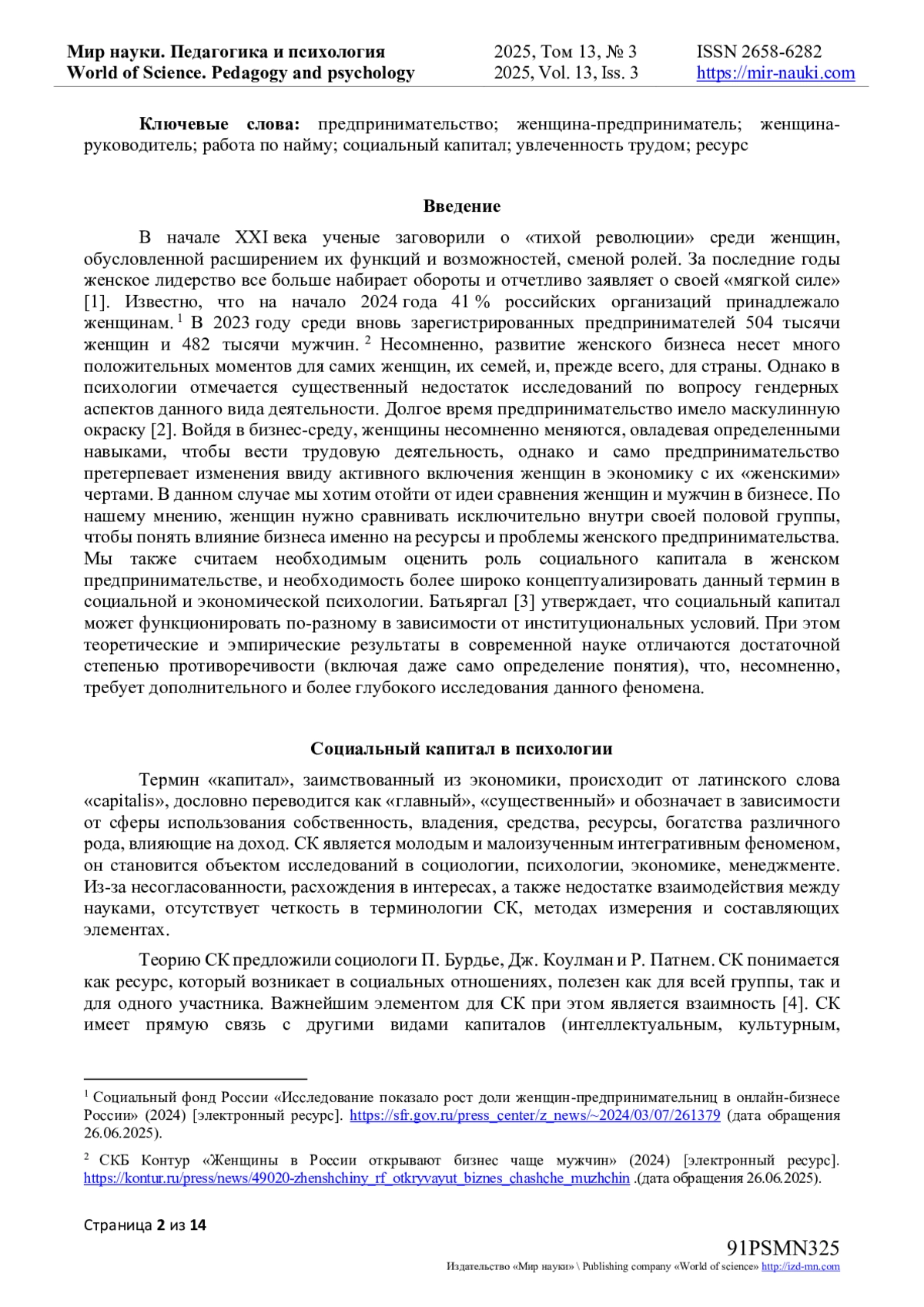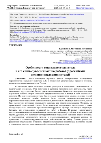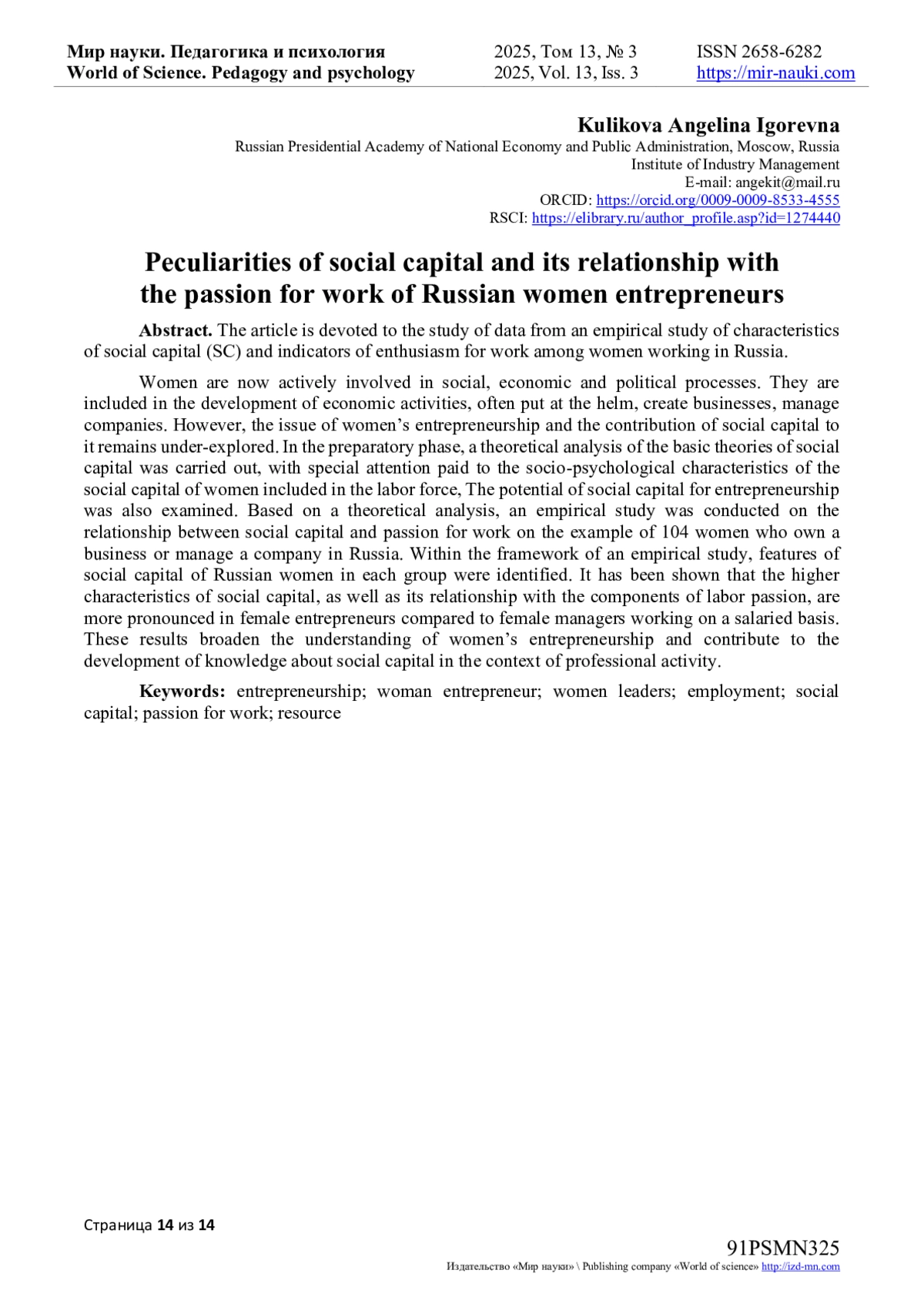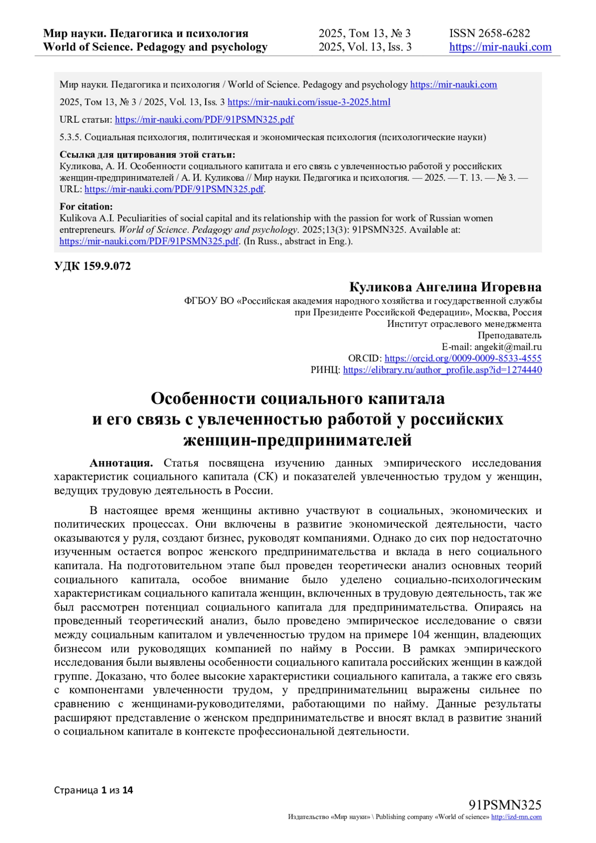 В настоящее время женщины активно участвуют в социальных, экономических и политических процессах. Они включены в развитие экономической деятельности, часто оказываются у руля, создают бизнес, руководят компаниями. Однако до сих пор недостаточно изученным остается вопрос женского предпринимательства и вклада в него социального капитала. На подготовительном этапе был проведен теоретически анализ основных теорий социального капитала, особое внимание было уделено социально-психологическим характеристикам социального капитала женщин, включенных в трудовую деятельность, так же был рассмотрен потенциал социального капитала для предпринимательства. Опираясь на проведенный теоретический анализ, было проведено эмпирическое исследование о связи между социальным капиталом и увлеченностью трудом на примере 104 женщин, владеющих бизнесом или руководящих компанией по найму в России. В рамках эмпирического исследования были выявлены особенности социального капитала российских женщин в каждой группе. Доказано, что более высокие характеристики социального капитала, а также его связь с компонентами увлеченности трудом, у предпринимательниц выражены сильнее по сравнению с женщинами-руководителями, работающими по найму. Данные результаты расширяют представление о женском предпринимательстве и вносят вклад в развитие знаний о социальном капитале в контексте профессиональной деятельности.