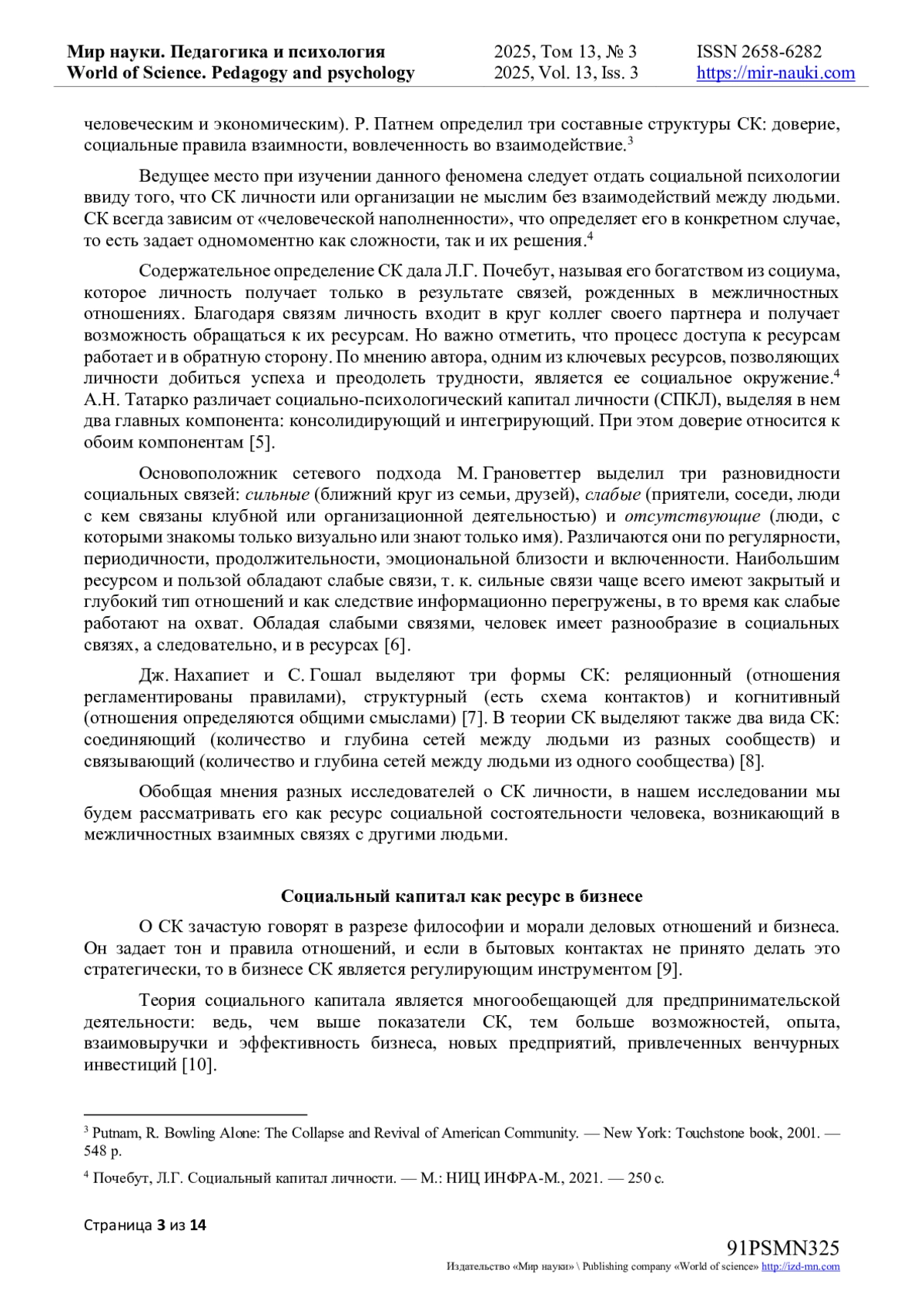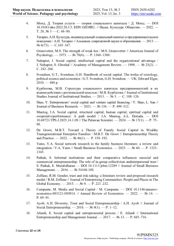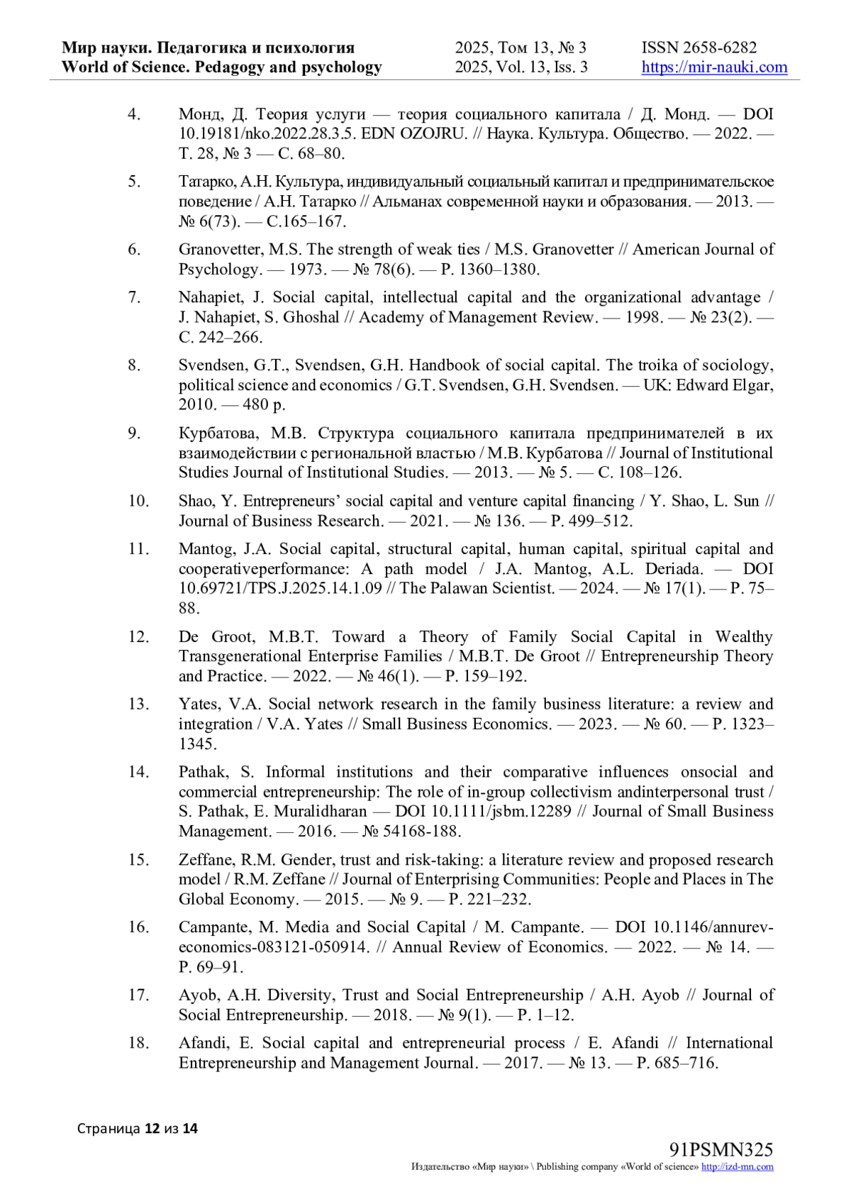 11. Mantog, J.A. Social capital, structural capital, human capital, spiritual capital and cooperativeperformance: A path model / J.A. Mantog, A.L. Deriada. // The Palawan Scientist. - 2024. - № 17(1). - Р. 75-88. DOI: 10.69721/TPS.J.2025.14.1.09