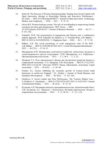 19. Setini M. The Passway of Women Entrepreneurship: Starting from Social Capital with Open Innovation, through to Knowledge Sharing and Innovative Performance / M. Setini. // Journal of Open Innovation: Technology, Market, and Complexity. - 2020. - № 6. - P. 25-32. DOI: 10.3390/joitmc6020025 EDN: QNSAEQ