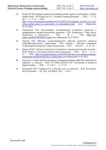 43. Темняткина О.В. Исследование мотивационной готовности педагогов к непрерывному профессиональному развитию / О.В. Темняткина // Мир науки. Педагогика и психология. - 2021. - № 1. - URL: https://mir-nauki.com/PDF/08PDMN121.pdf (дата обращения: 01.07.2025). EDN: KLQLYT