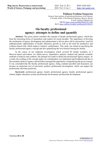Статья рассматривает понятие профессиональной субъектности преподавателя вуза, которое в последние десятилетия все больше привлекает внимание экспертов и исследователей. Значимость разработки механизма формирования такого рода субъектности обусловлена прежде всего потребностью высшей школы в антропоцентрических возможностях роста эффективности работы преподающих, а также поиском результативных и научно-обоснованных инструментов качественного улучшения деятельности преподавателей. Исследование ставило целью уточнить понятие профессиональной субъектности университетских преподавателей, а также количественно определить степень развития субъектности представителей рассматриваемой нами профессии.