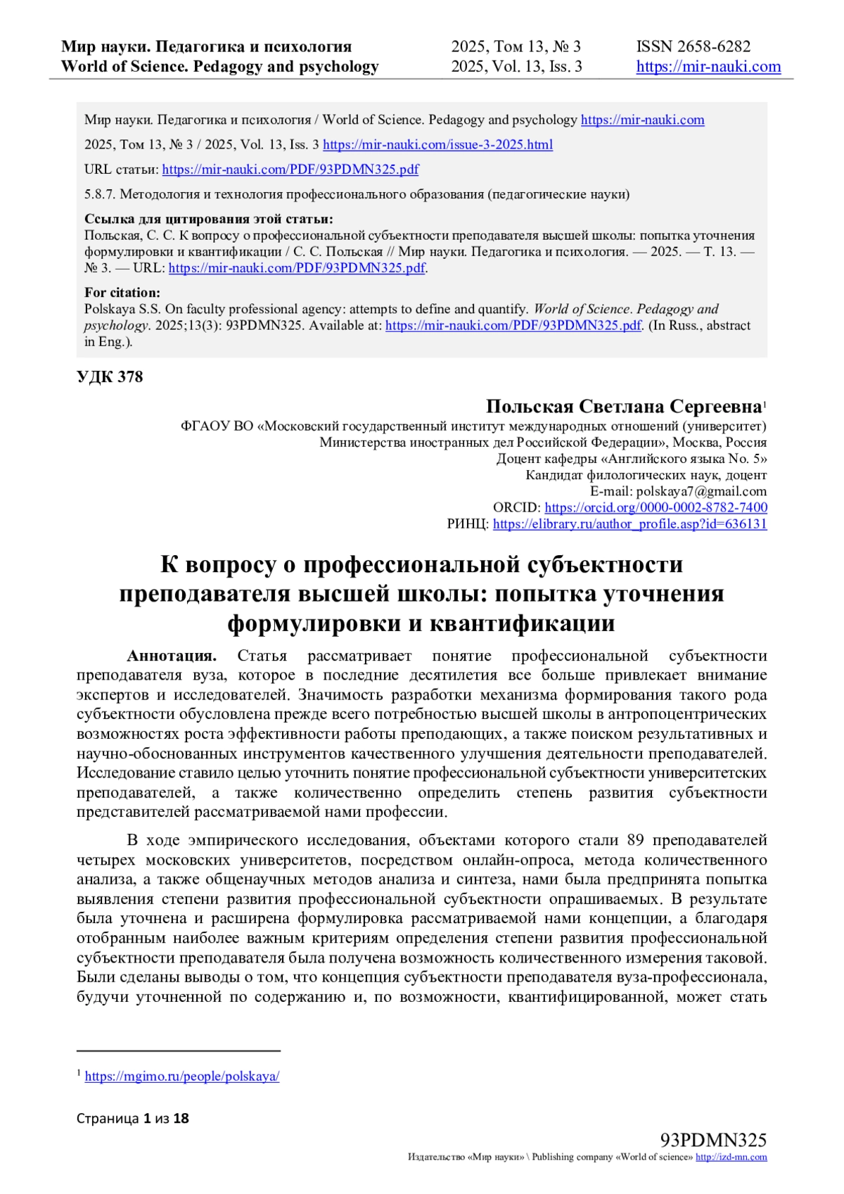 В ходе эмпирического исследования, объектами которого стали 89 преподавателей четырех московских университетов, посредством онлайн-опроса, метода количественного анализа, а также общенаучных методов анализа и синтеза, нами была предпринята попытка выявления степени развития профессиональной субъектности опрашиваемых. В результате была уточнена и расширена формулировка рассматриваемой нами концепции, а благодаря отобранным наиболее важным критериям определения степени развития профессиональной субъектности преподавателя была получена возможность количественного измерения таковой. Были сделаны выводы о том, что концепция субъектности преподавателя вуза-профессионала, будучи уточненной по содержанию и, по возможности, квантифицированной, может стать важным инструментом профессионального развития представителей данной профессии, влияющим на результаты их деятельности.