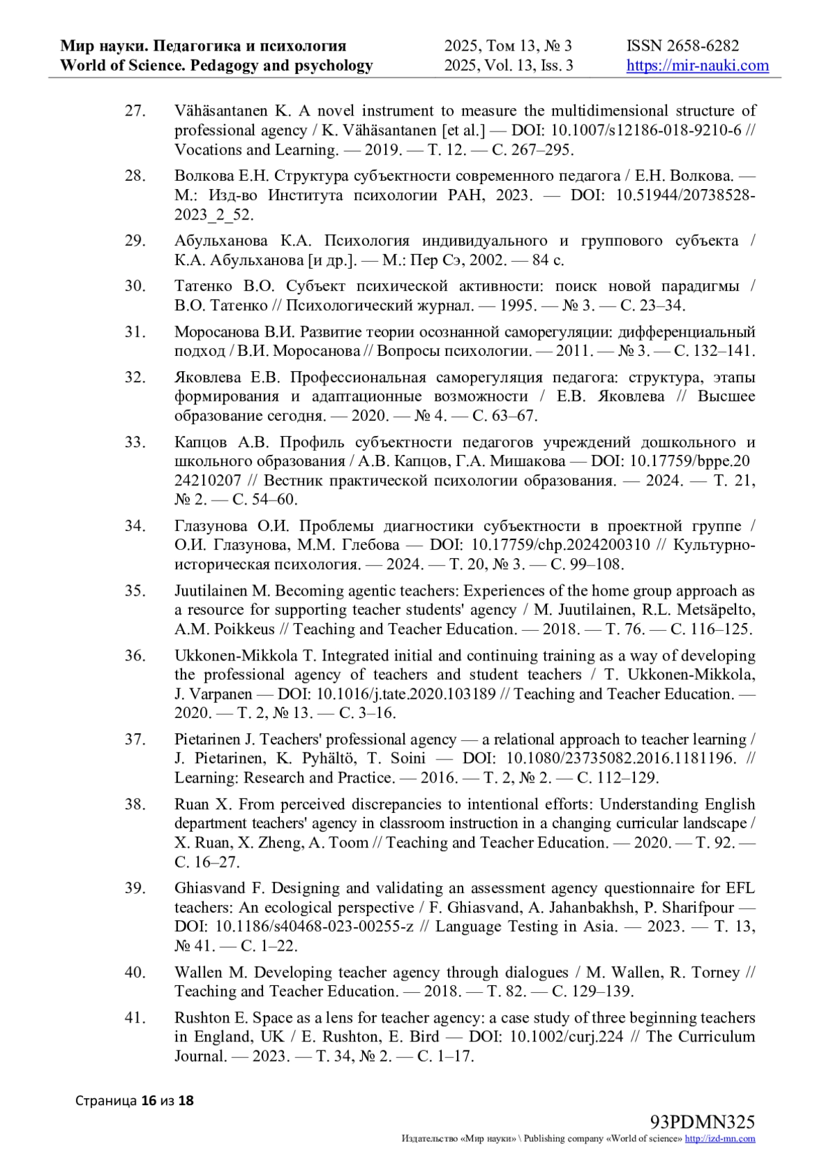 37. Pietarinen J. Teachers’ professional agency - a relational approach to teacher learning / J. Pietarinen, K. Pyhältö, T. Soini - // Learning: Research and Practice. - 2016. - Т. 2, № 2. - С. 112-129. DOI: 10.1080/23735082.2016.1181196