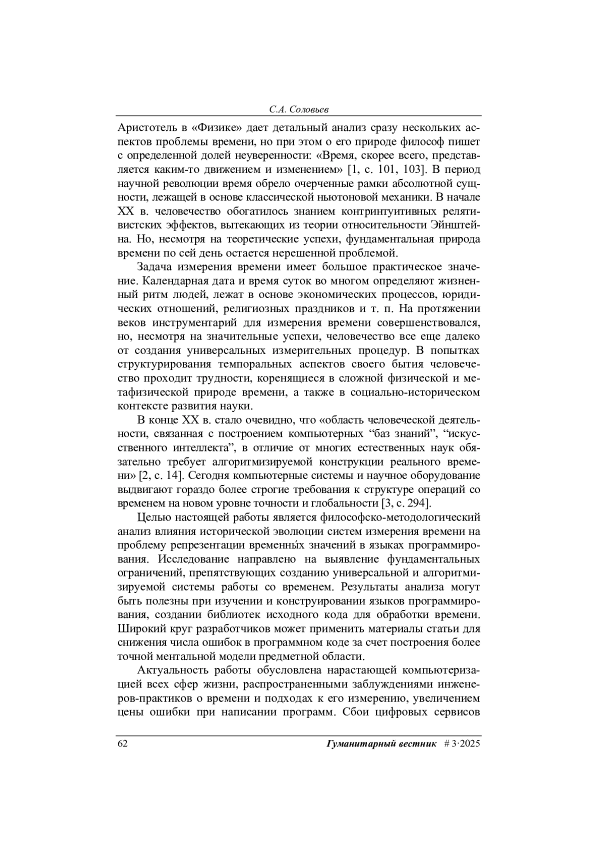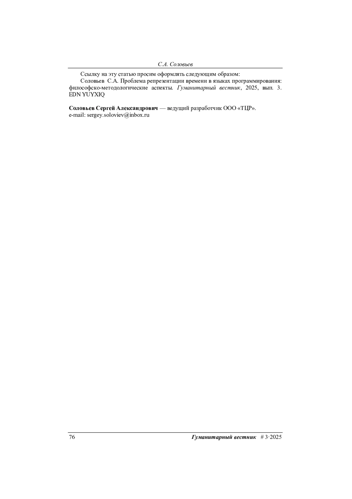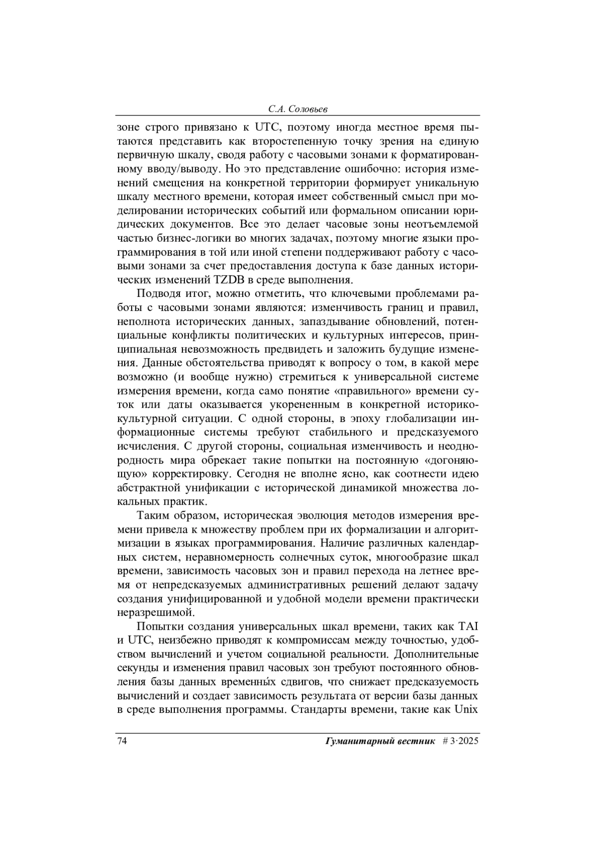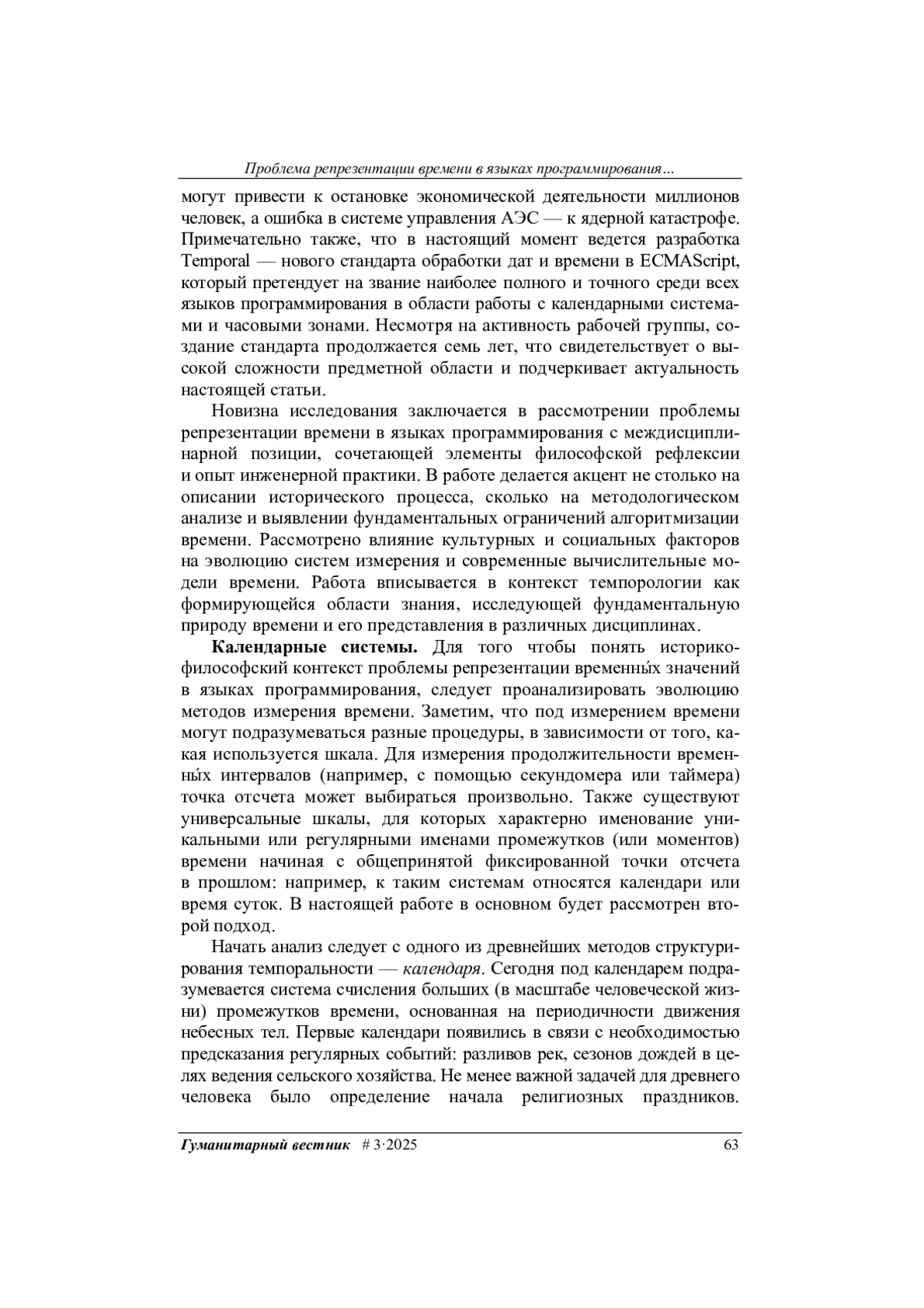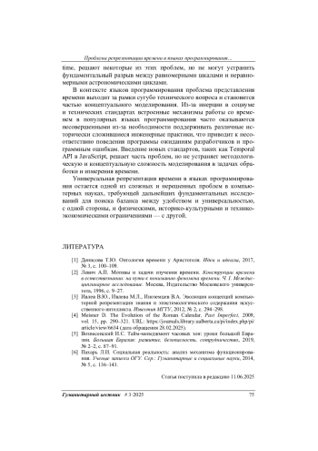 Проведен междисциплинарный анализ эволюции методов структурирования темпоральности человеком. Показано влияние исторических событий на инженерную практику конструирования языков программирования. Выявлены трудности построения формализуемой и алгоритмизируемой модели времени, коренящиеся в различных этапах развития инструментария его измерения. Проанализированы ограничения в устройстве временных моделей, вызванные влиянием исторического развития календарных систем, шкал времени и концепции часовых зон. Учтены проблемы, связанные с календарными реформами, нерегулярностью астрономических циклов, постоянным уточнением временных шкал и изменением метрологических оснований, подвижностью границ и корректировкой правил административных часовых зон. Показано, что социокультурные факторы — региональные традиции, социальная инерция — вносят значимый вклад в проблему репрезентации времени в языках программирования наравне с физическими факторами. Рассмотрены фундаментальные методологические ограничения существующих инженерных решений, таких как Unix time и Time Zone Database. Продемонстрировано, как компромиссы и допущения в моделях времени порождают ошибки при высокоточной синхронизации и долговременном хранении данных. Новизна исследования заключается в системном сопоставлении культурно-исторической трансформации подходов к измерению времени с конкретными архитектурными вызовами при проектировании языков программирования и инженерных стандартов. Сделан вывод о невозможности построения универсальной темпоральной модели в силу фундаментального конфликта между идеальной природой математических моделей времени и непредсказуемостью социальной и физической реальности. Показано, что задача синхронизации шкалы времени с социальными и биологическими циклами на Земле неизбежно приводит к ее нерегулярности и требует постоянной ручной корректировки, исключая возможность полной алгоритмизации. Отмечено, что проблема предела формализации времени в контексте создания языков программирования нуждается в дальнейшем философско-методологическом анализе.
