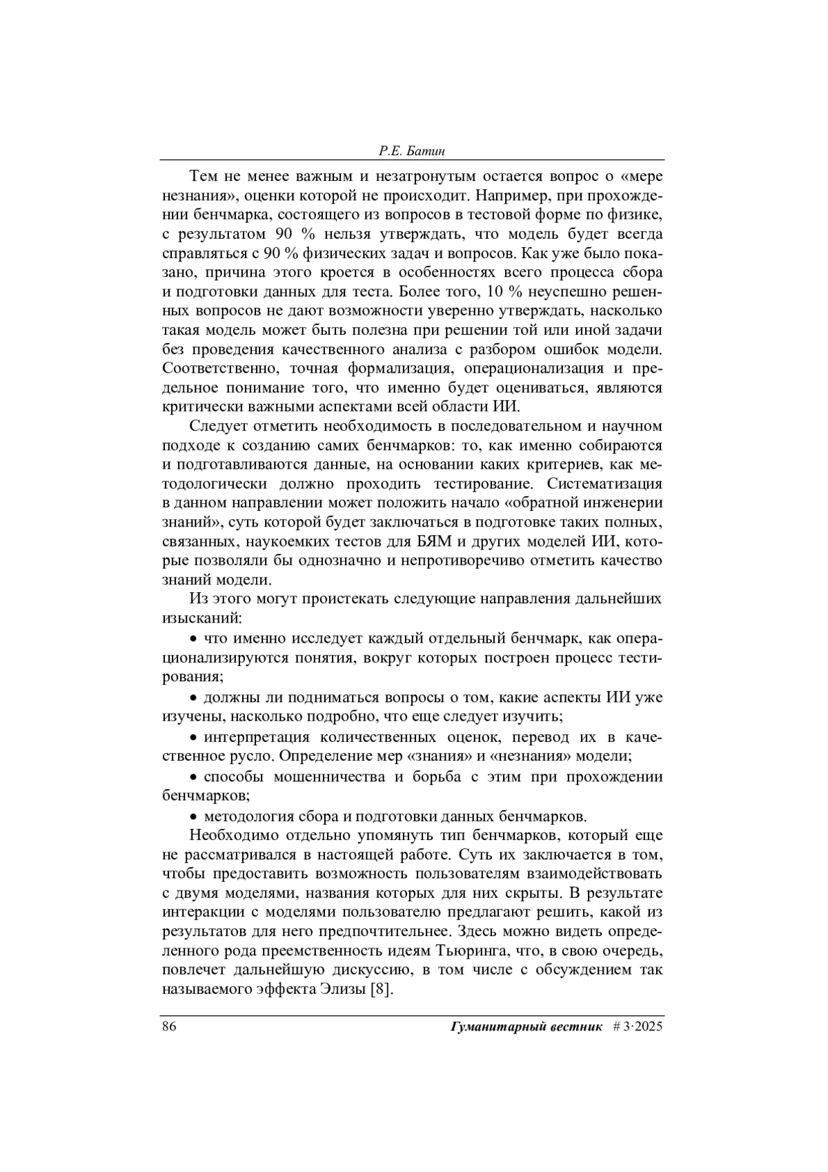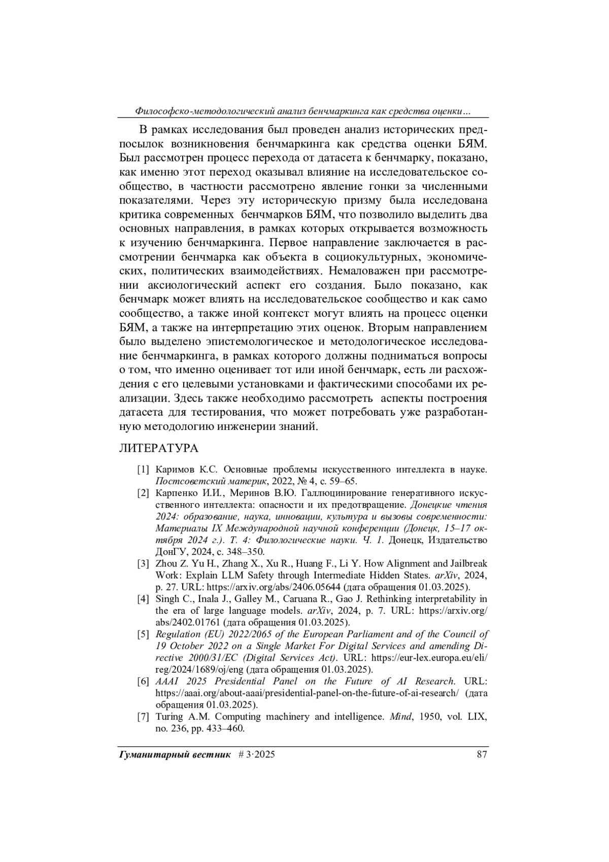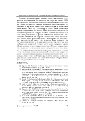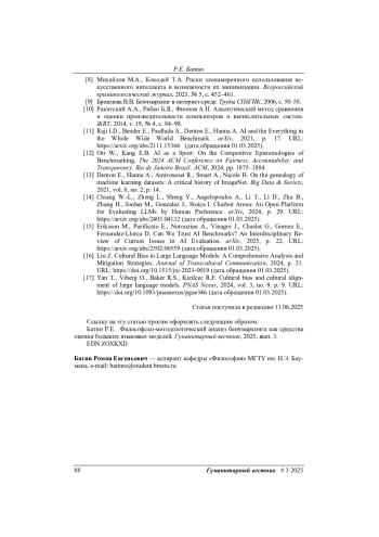 15. Eriksson M., Purificato E., Noroozian A., Vinagre J., Chaslot G., Gomez E., Fernandez-Llorca D. Can We Trust AI Benchmarks? An Interdisciplinary Review of Current Issues in AI Evaluation. arXiv, 2025, p. 22. URL: https://arxiv.org/abs/2502.06559 (дата обращения 01.03.2025).