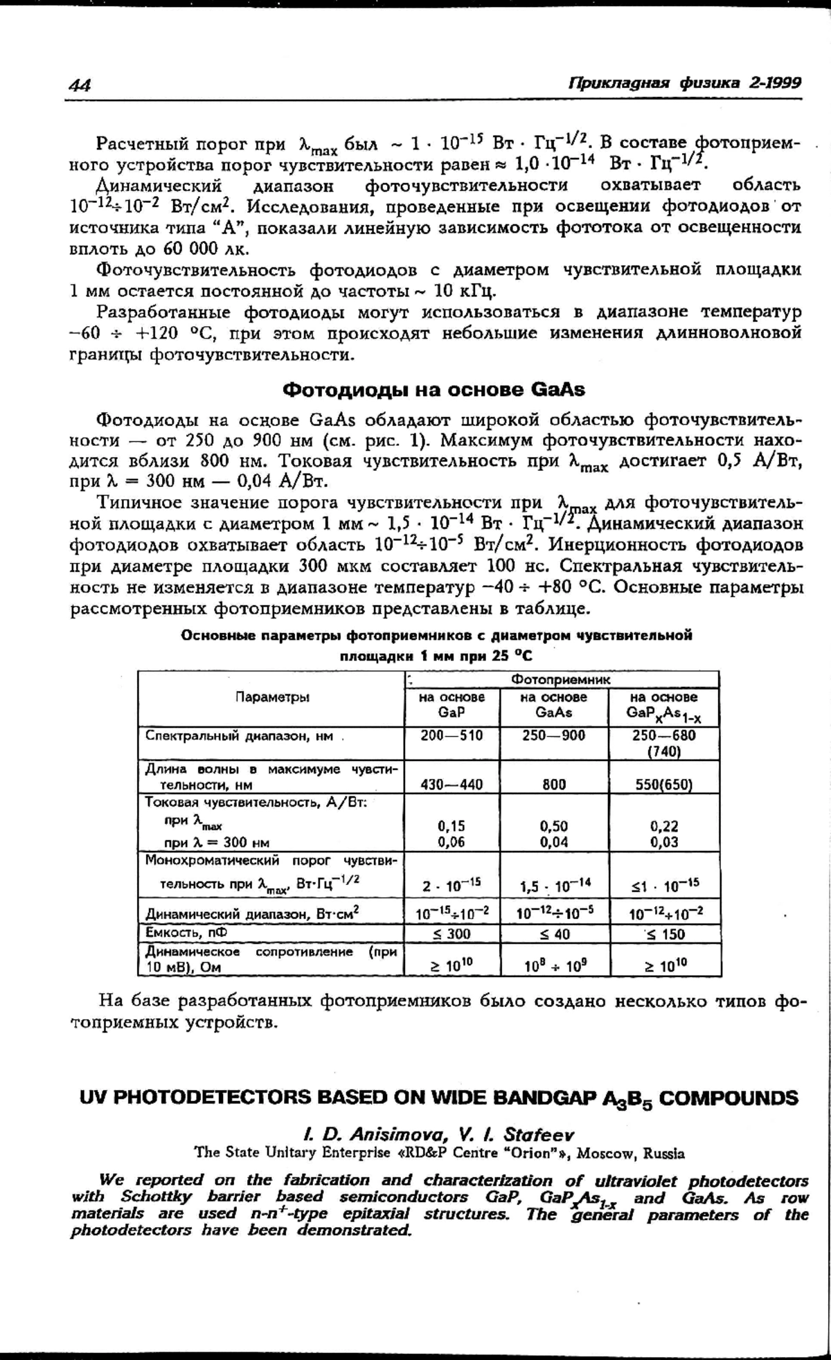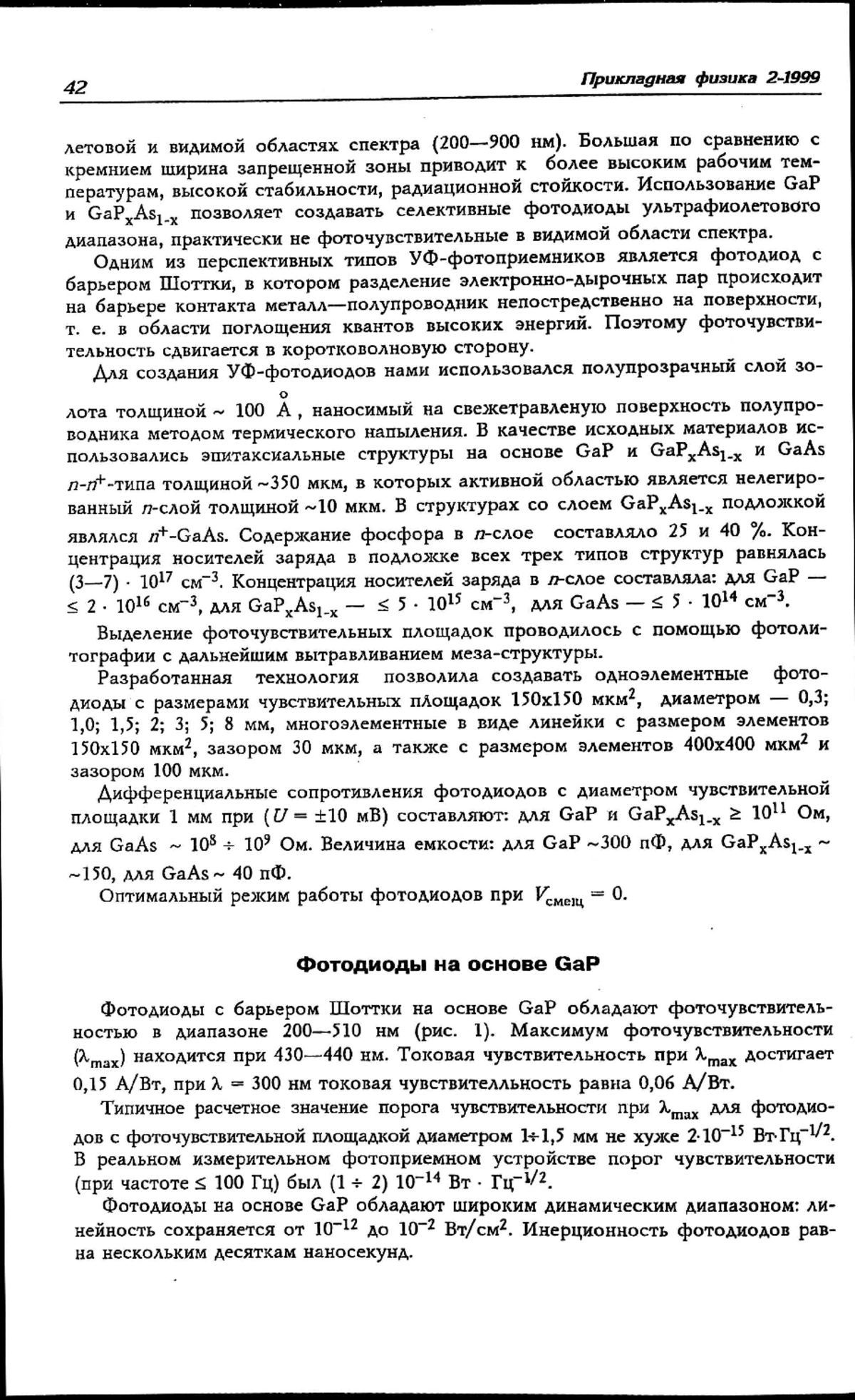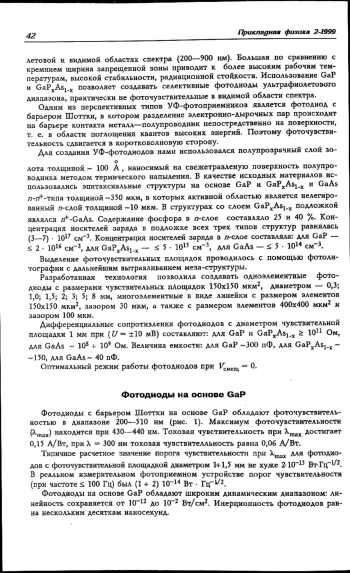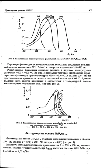 Разработаны фотоприемники на основе широкозонных полупроводниковых материалов GaP, GaAs и их тройного соединения GaPхAs1-х. Для создания фотоприемников использован барьер Шоттки с полупрозрачным металлическим слоем. В качестве исходного материала использованы эпитаксиальные структуры n-n+-n типа с нелегированным n-слоем. Приведены основные параметры фотоприемников.