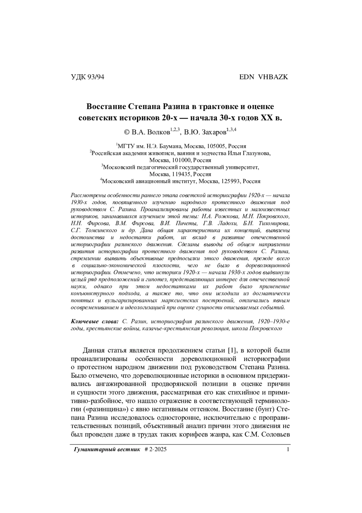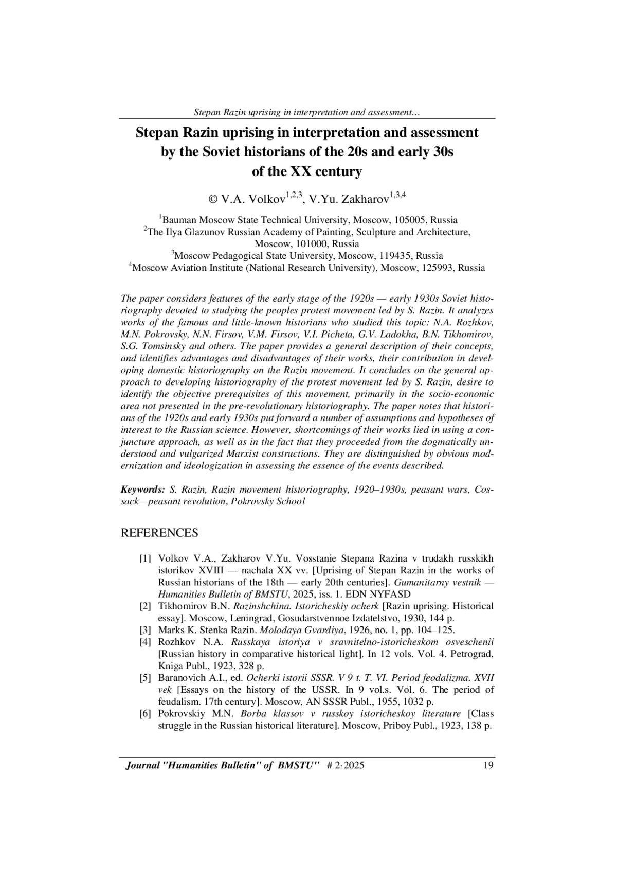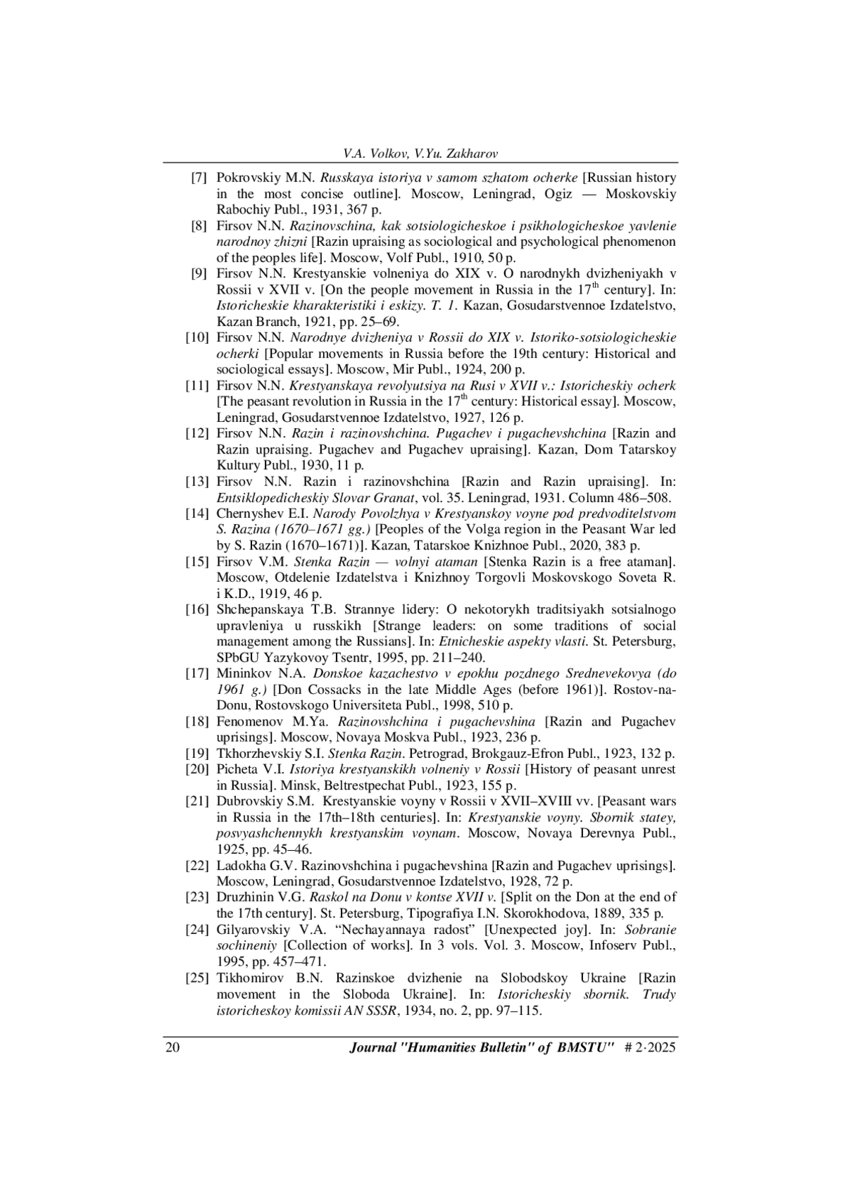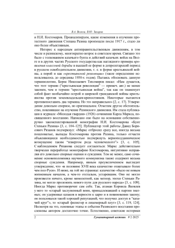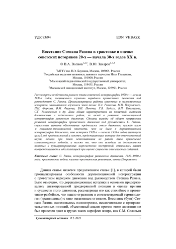 1. Волков В.А., Захаров В.Ю. Восстание Степана Разина в трудах русских историков XVIII - начала XX в. Гуманитарный вестник, 2025, вып. 1.