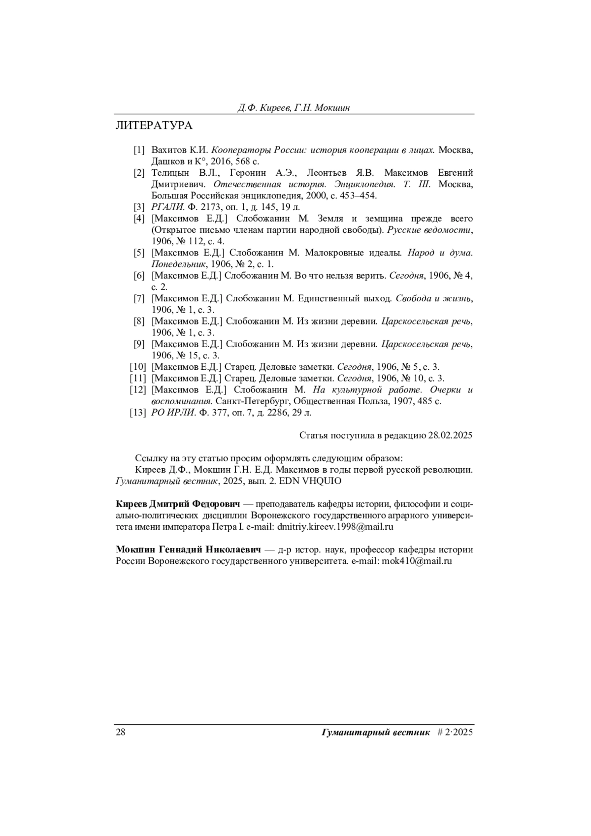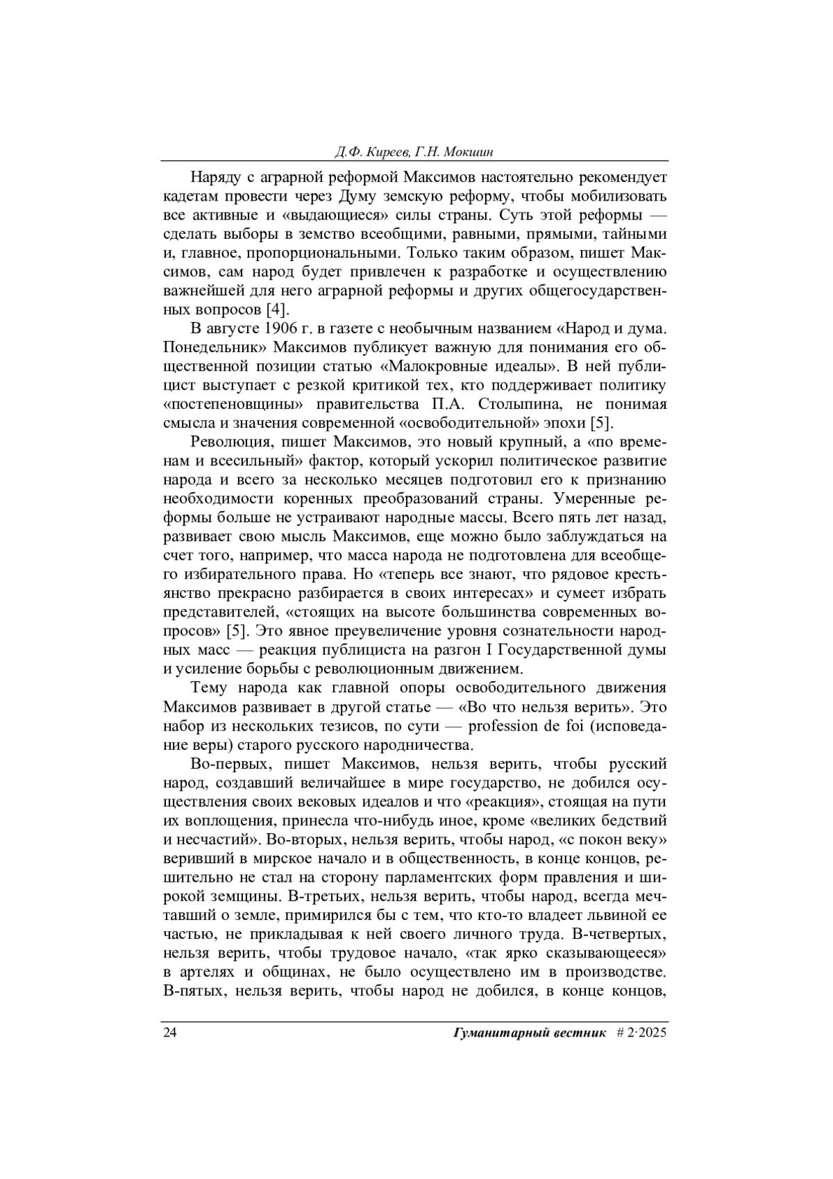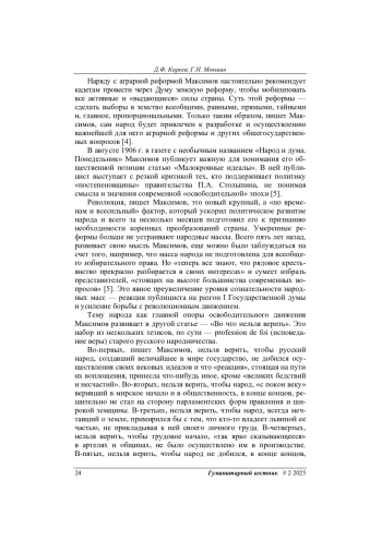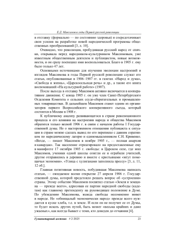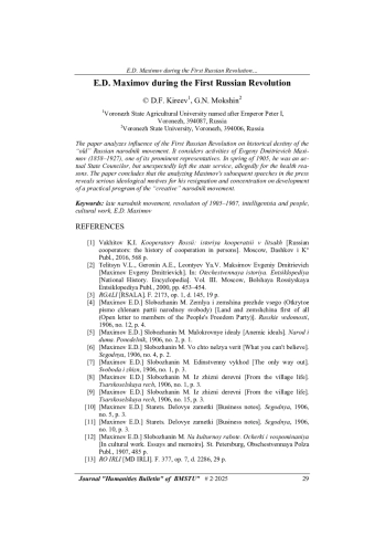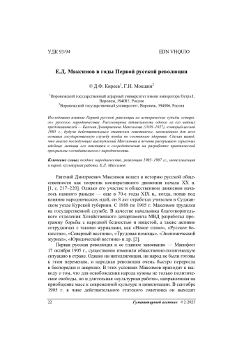 Исследовано влияние Первой русской революции на исторические судьбы «старого» русского народничества. Рассмотрена деятельность одного из его видных представителей — Евгения Дмитриевича Максимова (1858–1927), который весной 1905 г., будучи действительным статским советником, неожиданно для всех оставил государственную службу якобы по состоянию здоровья. Сделан вывод, что анализ последующих выступлений Максимова в печати раскрывает серьезные идейные мотивы его отставки и сосредоточения на разработке практической программы «созидательного» народничества.