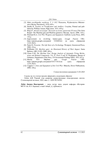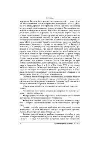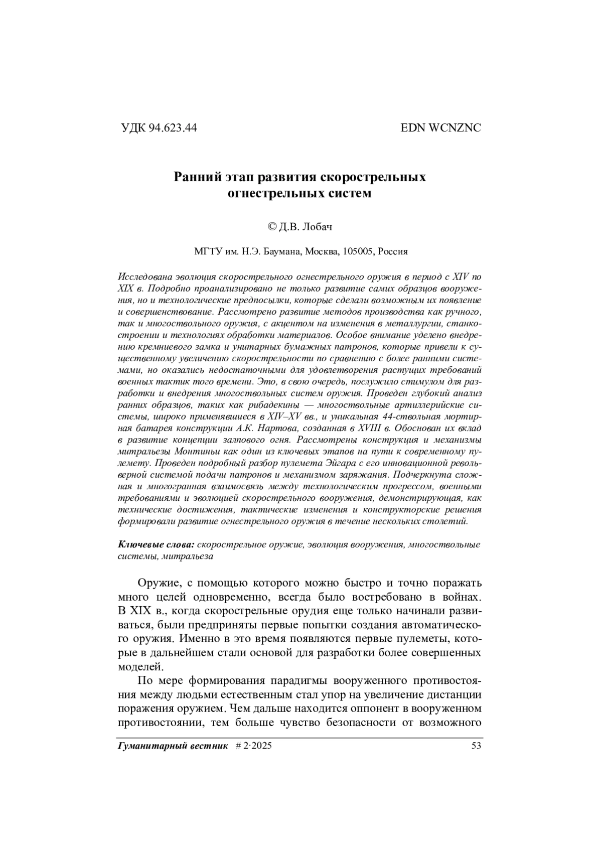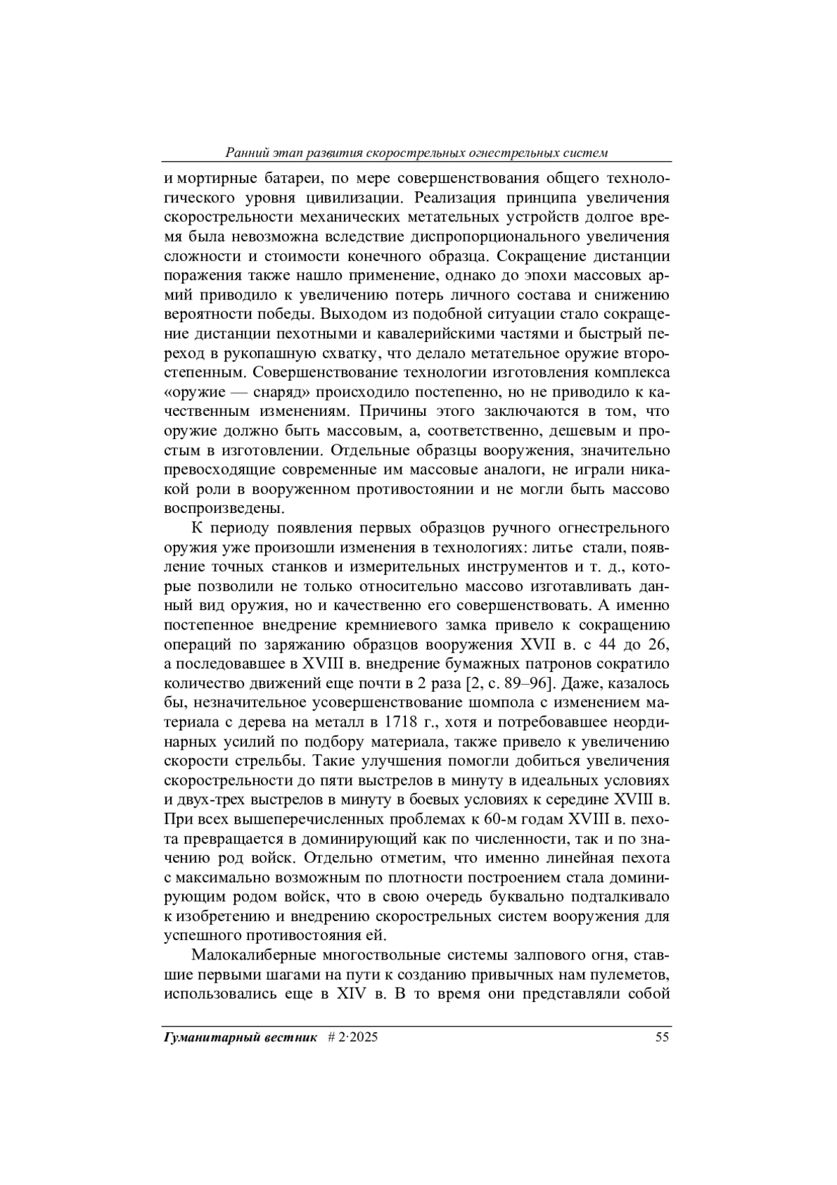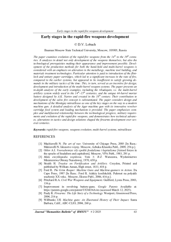 Исследована эволюция скорострельного огнестрельного оружия в период с XIV по XIX в. Подробно проанализировано не только развитие самих образцов вооружения, но и технологические предпосылки, которые сделали возможным их появление и совершенствование. Рассмотрено развитие методов производства как ручного, так и многоствольного оружия, с акцентом на изменения в металлургии, станкостроении и технологиях обработки материалов. Особое внимание уделено внедрению кремниевого замка и унитарных бумажных патронов, которые привели к существенному увеличению скорострельности по сравнению с более ранними системами, но оказались недостаточными для удовлетворения растущих требований военных тактик того времени. Это, в свою очередь, послужило стимулом для разработки и внедрения многоствольных систем оружия. Проведен глубокий анализ ранних образцов, таких как рибадекины — многоствольные артиллерийские системы, широко применявшиеся в XIV–XV вв., и уникальная 44-ствольная мортирная батарея конструкции А. К. Нартова, созданная в XVIII в. Обоснован их вклад в развитие концепции залпового огня. Рассмотрены конструкция и механизмы митральезы Монтиньи как один из ключевых этапов на пути к современному пулемету. Проведен подробный разбор пулемета Эйгара с его инновационной револьверной системой подачи патронов и механизмом заряжания. Подчеркнута сложная и многогранная взаимосвязь между технологическим прогрессом, военными требованиями и эволюцией скорострельного вооружения, демонстрирующая, как технические достижения, тактические изменения и конструкторские решения формировали развитие огнестрельного оружия в течение нескольких столетий.