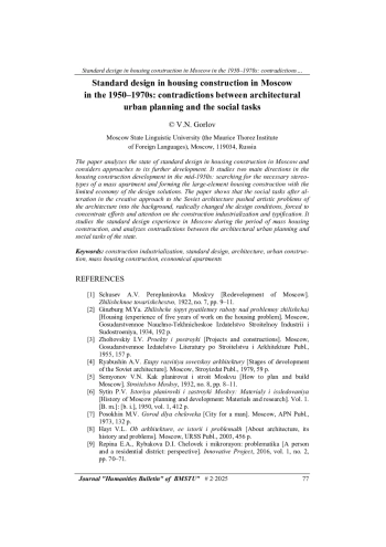 12. Улько А.С., Ястребова И.М. Стандартизация и типизация в отечественном жилищном строительстве (1930-1950 гг.). Architecture and Modern Information Technologies, 2020, № 2, с. 69-79.