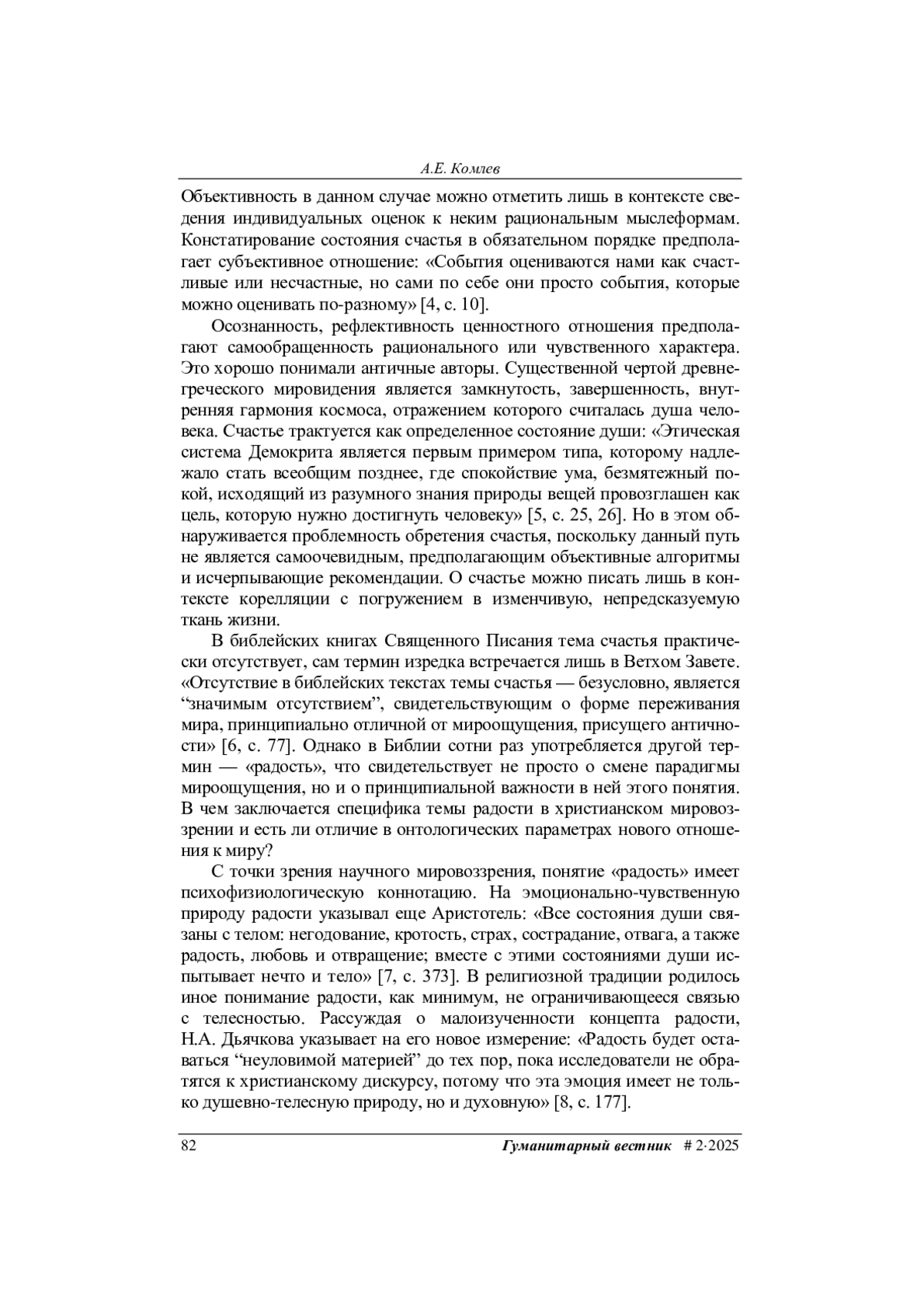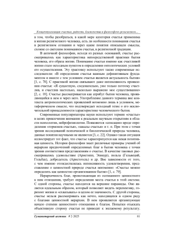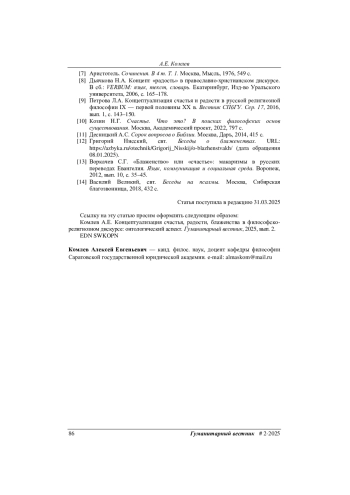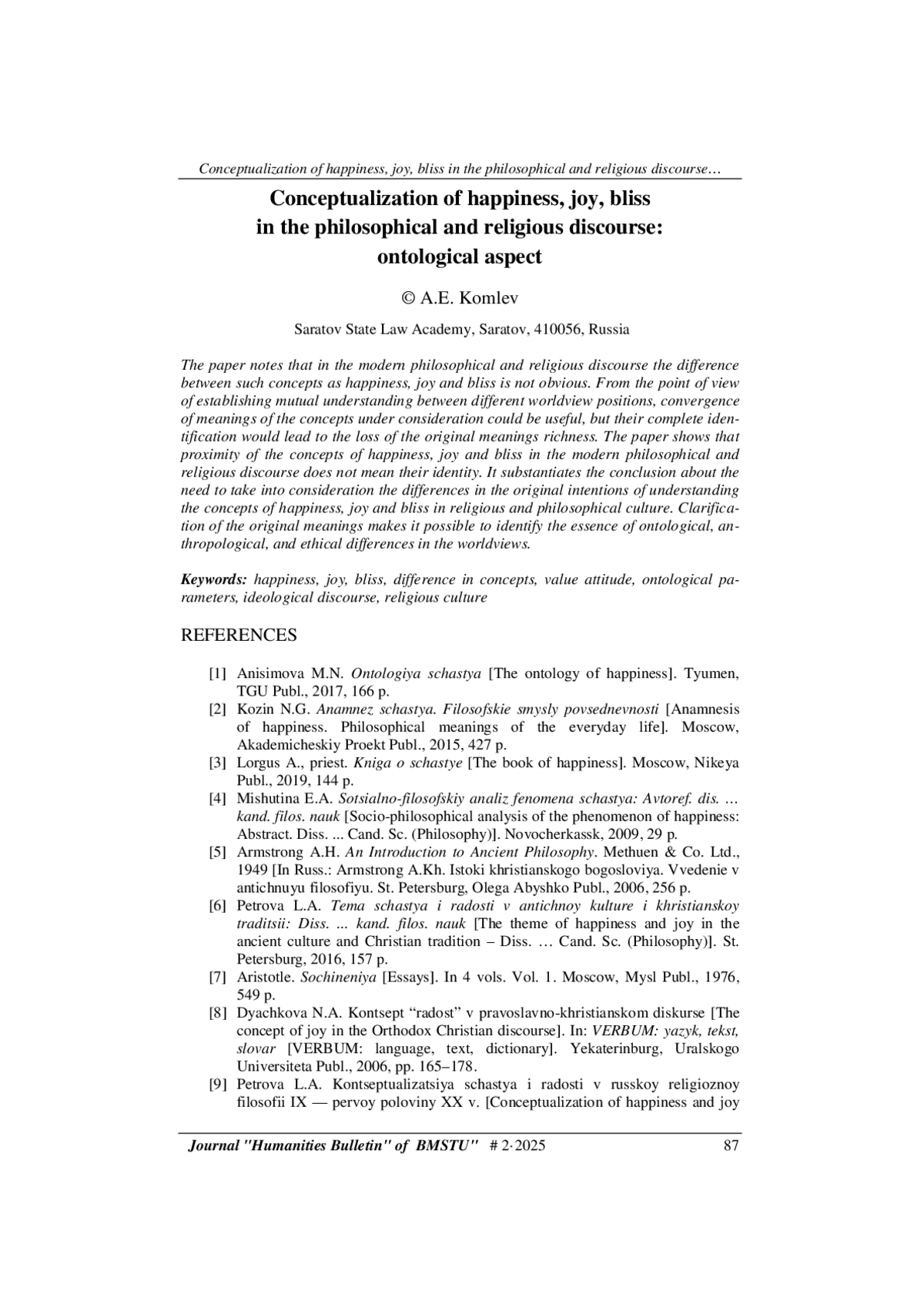 Отмечено, что в современном философско-религиозном дискурсе не очевидно различие таких понятий, как счастье, радость и блаженство. С точки зрения установления взаимопонимания между различными мировоззренческими позициями сближение смыслов рассматриваемых концептов может иметь пользу, однако их полное отождествление приведет к утрате богатства изначальных значений. Показано, что близость понятий счастья, радости и блаженства в современном философско-религиозном дискурсе не означает их тождества. Обоснован вывод о необходимости принятия во внимание различий исходных интенций понимания концептов счастья, радости и блаженства в религиозной и философской культуре. Прояснение изначальных смыслов позволяет выявить суть онтологических, антропологических, этических различий мировоззрений.