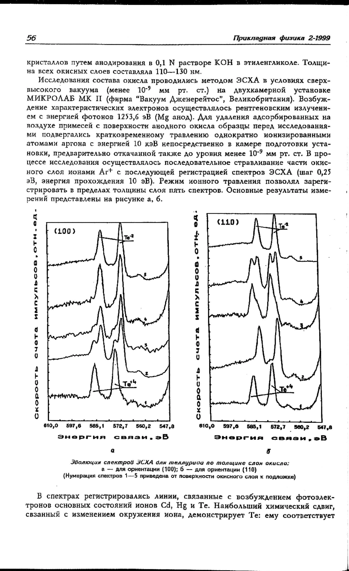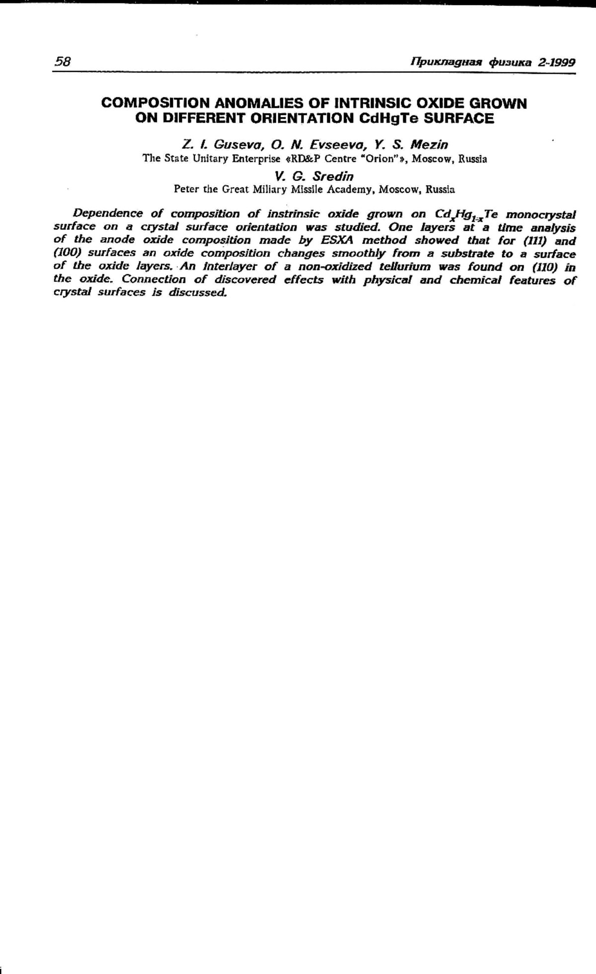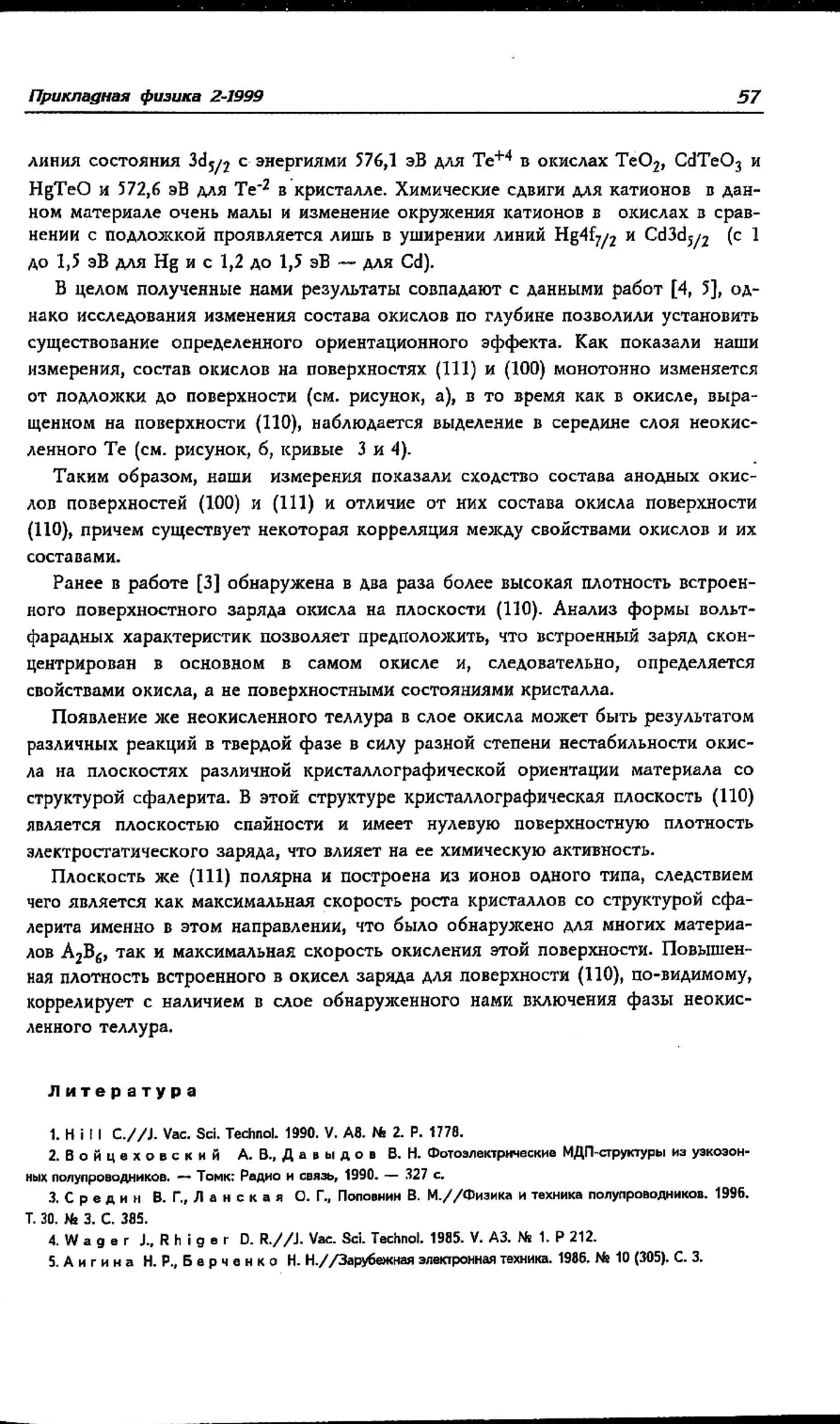 Проведены исследования зависимости состава собственного окисла, выращенного на поверхности монокристаллов CdхHg1-хTe, от ориентации поверхностей кристаллов. Выполненный методом ЭСХА послойный анализ состава анодного окисла показал, что для плоскостей (111) и (100) состав окисла плавно изменяется от подложки к поверхности окисного слоя. В окисле же на поверхности (110) обнаружена прослойка неокисленного теллура. В работе обсуждается связь обнаруженных эффектов с физико-химическими свойствами поверхностей кристалла.
