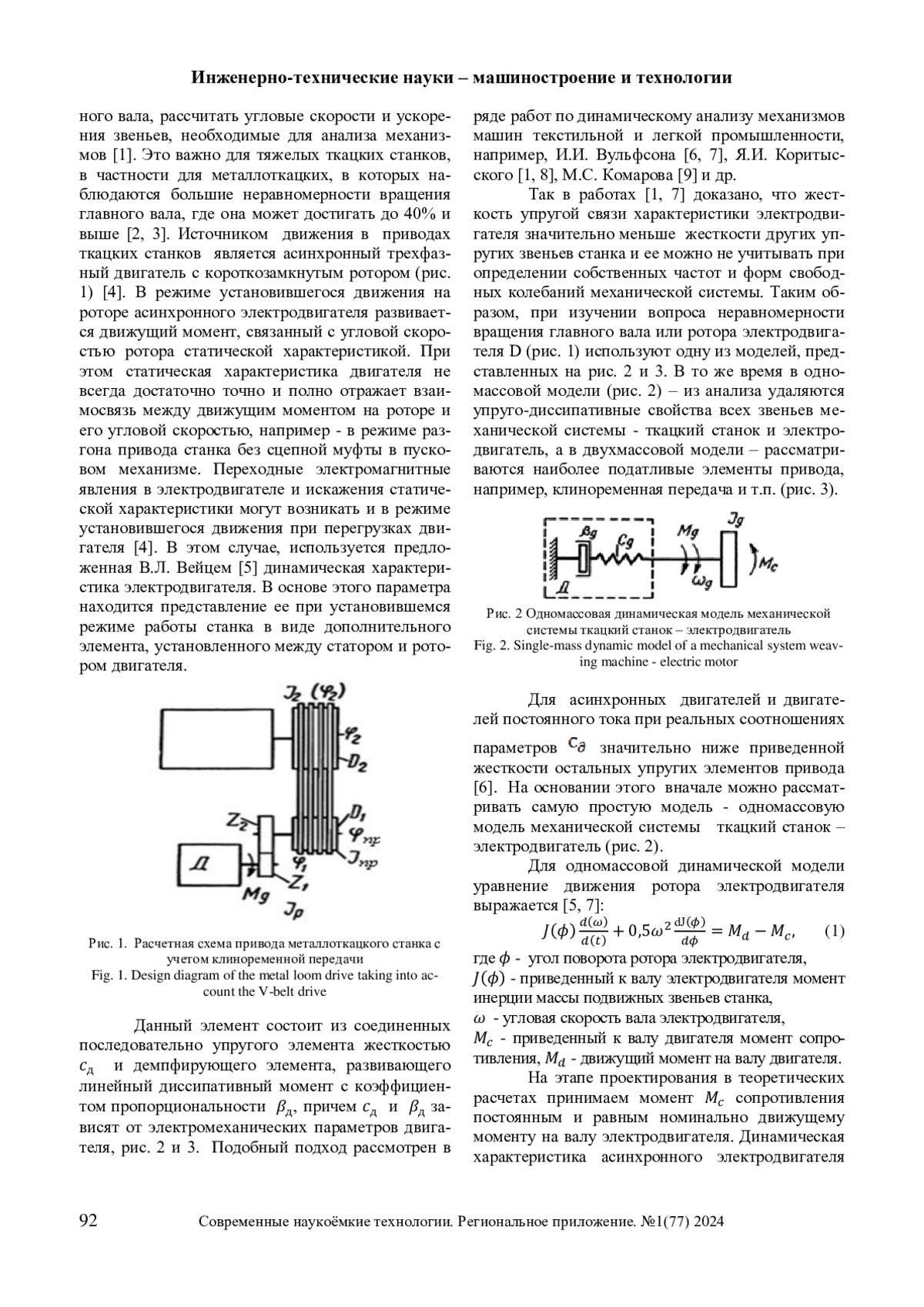 Для анализа динамических процессов ткацкого станка нужно знать закон изменения угловой скорости главного вала. Так как жесткость упругой связи характеристики электродвигателя значительно меньше жесткости других упругих звеньев станка и ее можно не учитывать при определении собственных частот и форм свободных колебаний механической системы. Таким образом, при изучении вопроса неравномерности вращения главного вала используют одномассовую или двухмассовую модели. При использовании одномассовой модели из анализа удаляются упруго-диссипативные свойства всех звеньев механической системы ткацкий станок и электродвигатель, а в двухмассовой модели - рассматриваются наиболее податливые элементы привода, например, клиноременная передача и т. п. Разработана математическая модель установившегося вращения главного вала с учетом динамической характеристики электродвигателя металлоткацких станков типа СТР для обоих вариантов динамической модели.