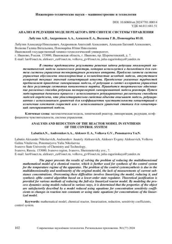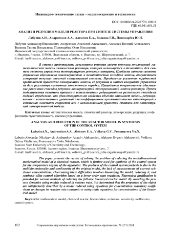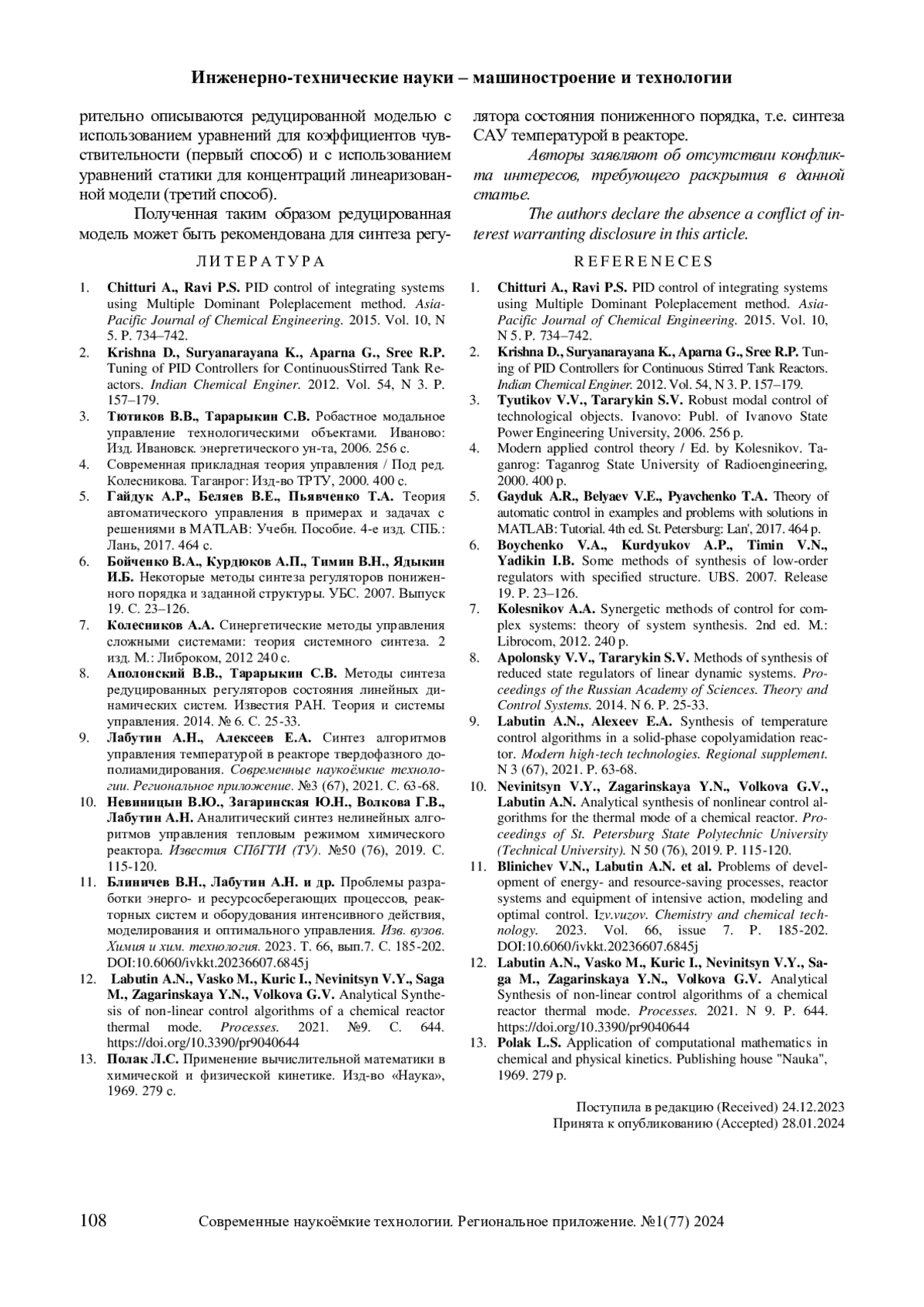 12. Labutin A.N., Vasko M., Kuric I., Nevinitsyn V.Y., Saga M., Zagarinskaya Y.N., Volkova G.V. Analytical Synthesis of non-linear control algorithms of a chemical reactor thermal mode. Processes. 2021. №9. С. 644. DOI: 10.3390/pr9040644 EDN: VTRRVE